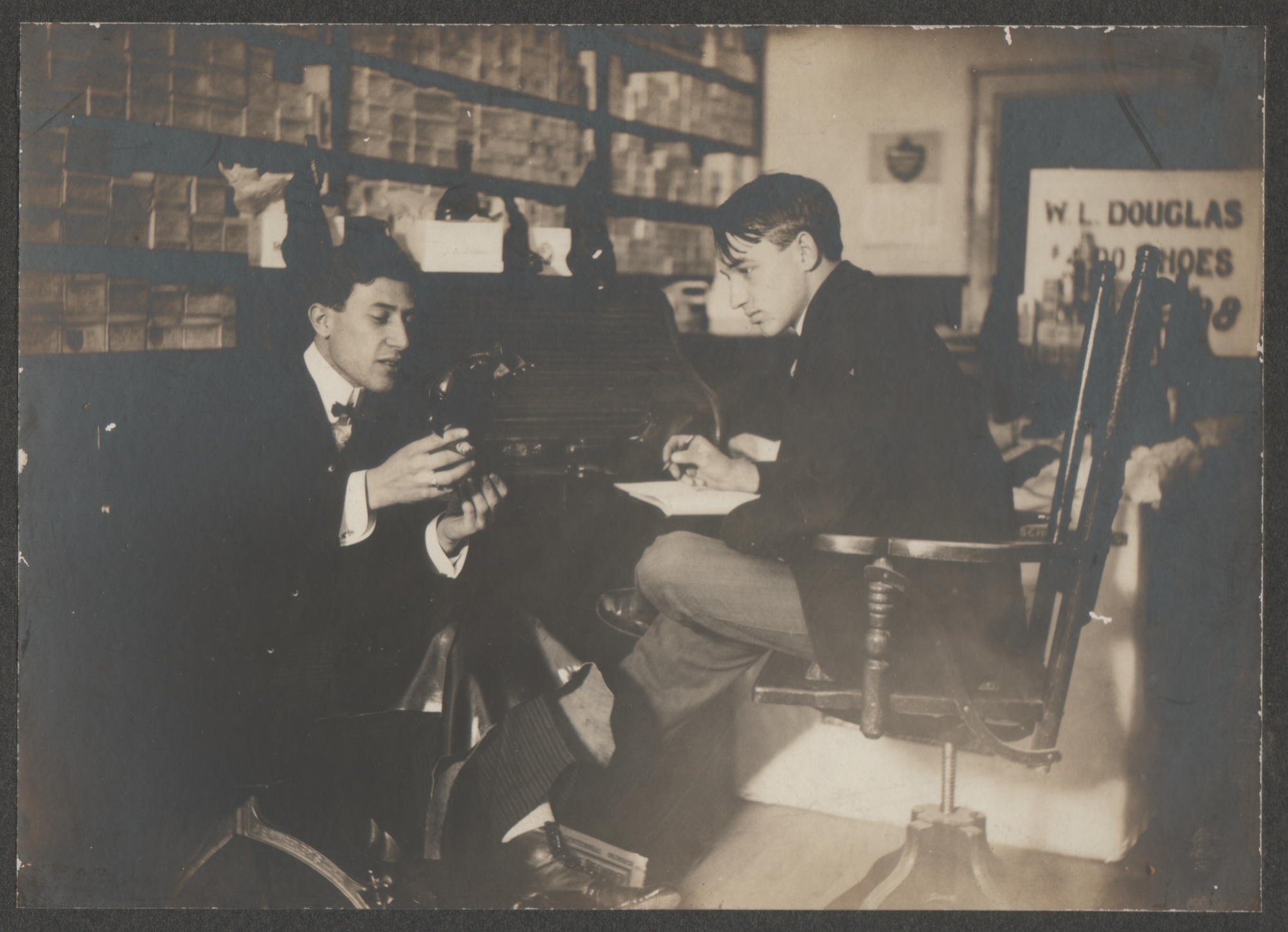 The sign at the back refers to the W. L. Douglas Shoe Company. Founded in Brockton, Massachusetts, in 1876, it was very successful until around WWI, after which sales started to fall and it was bought by another company. But it was the first shoe company to have its own chain of retail stores, in its heyday having as many as 78 to 105 (depending on which source you read) scattered across the country, in addition to having its shoes sold by other retailers. Meanwhile, the William Lewis Douglas who founded this company entered politics at the height of his financial success and became Governor of Massachusetts! (Apparently his political career didn’t match the popularity of his shoes. One of his first actions was a failed attempt to establish a leper colony in Brewster, MA, and it was downhill from there.) I don’t know if this is one of the dedicated Douglas shoe stores, or a store that happens to sell Douglas shoes. As far as I can tell, it could be anywhere in the country. The sign inside suggests to me that Douglas shoes are just one of the lines this store carries, but I could be wrong. I’m also not sure what the man on the left is holding, though it appears to be an unlaced boot (plus, by the way, a cigar). The lighting is awkward enough that it’s not clear. It seems he’s wearing an apron, or at least has some protective covering in his lap, which suggests he might be engaged in shoe repair. I’m guessing the guy at the desk was doing some bookkeeping, and the guy in the apron interrupted him to give him a progress report, or perhaps to show off some new merchandise. But who knows? (And that’s assuming there’s an actual story behind this scene, that the store employees aren’t staging a completely phony pose for some reason.) Speaking of the lighting, there seems to be a bright light pouring in from behind the camera (perhaps sunlight?), while the window at the back seems to be covered (at first I thought it was just dark out, but note the way the shade billows out at the bottom). My guess is that sunlight is streaming in from the front of the store, while these two men are working in the back. But, as always, I’m open to other suggestions. Meanwhile, if anyone is interested, here is a vintage picture of the Douglas Shoe Company factory in Brockton.