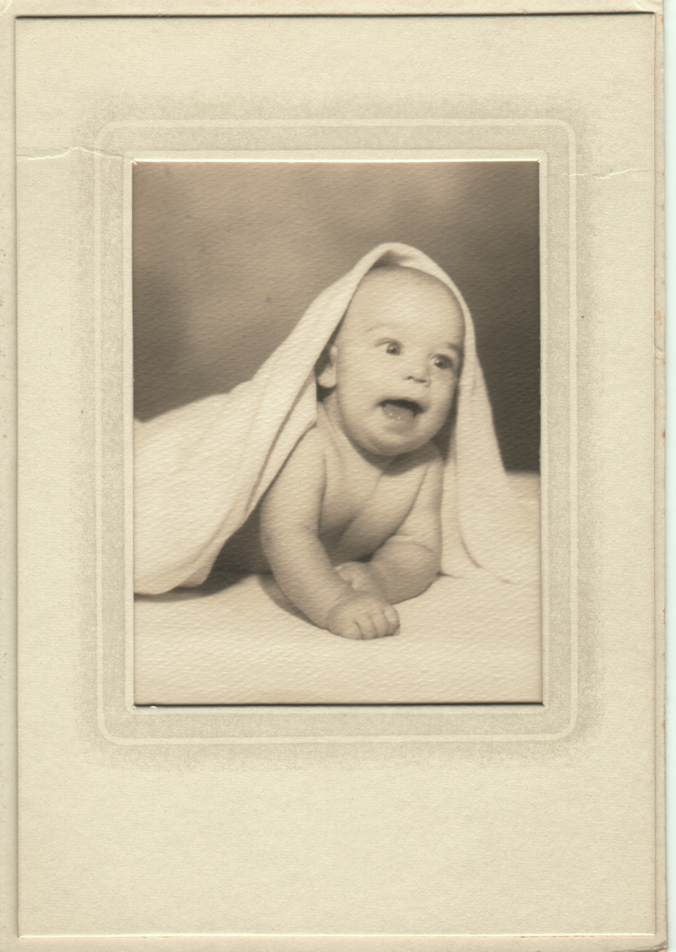 Photo (3.5 x 4.5 inches) mounted into a cardboard frame/folder (I have cropped much of the folder from this scan).