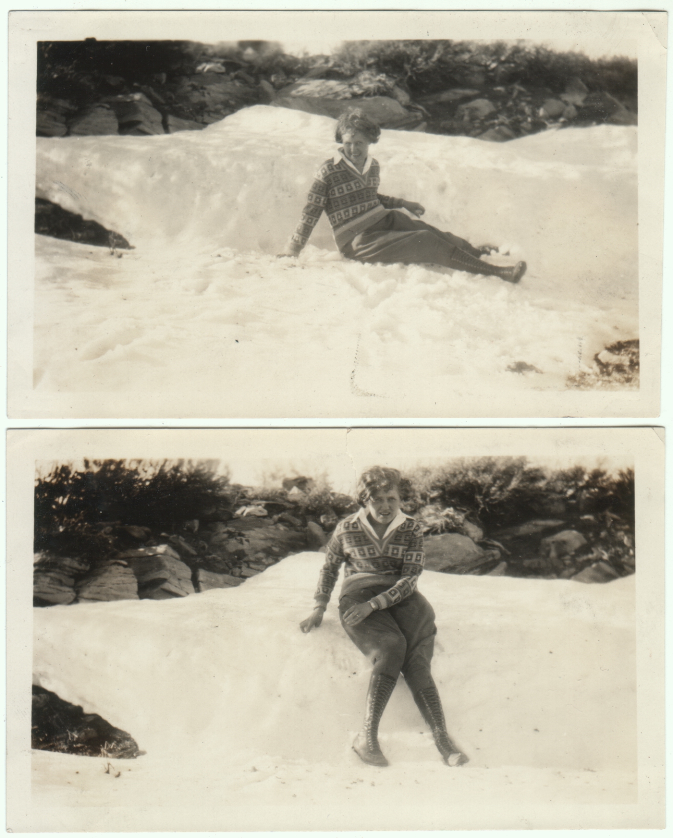 2. From her clothing and the bare rocks and plants behind her, I would guess she is frolicking on the remnants of a snow drift in the early spring.