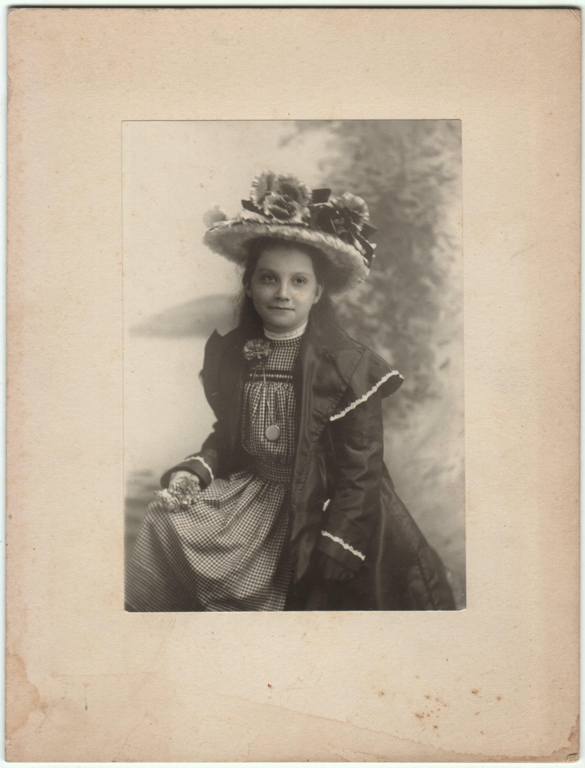 I believe this is the same girl who can be found here and here. I always assumed she was an older version of the girl in the other pictures, but looking closer as I created this post, I realized she’s wearing the same dress as the photo with just the boy, so maybe this is the same photo session as that one. In any case, she’d beautiful, dressed to the nines, and looks ready to have a splendid day. By the way, it wasn’t until I blew up the scan that I noticed her eyes have been touched up with little black dots on the pupils to make them pop. Sometimes that trick is done inexpertly and makes the subject look like and alien. But here it is effective.