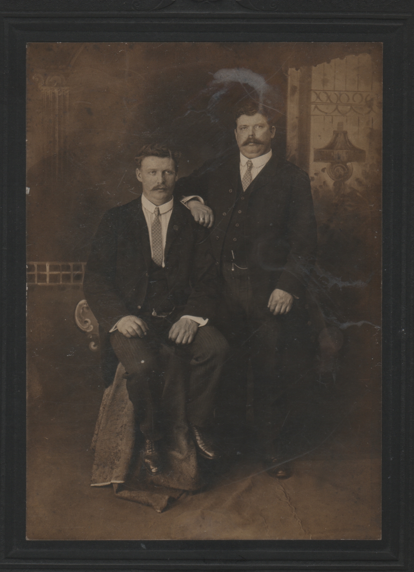 I’m beginning to realize that scanning photos can be a way of getting past the sorts of surface damage that obscure the image when you look at it in person.  This photo is a good example.  There is general silvering overall, plus there are silver smears that look like somebody spilled something on it.  But those are all minimized in the scan, and the image can be seen with much greater clarity than when I’m just looking at it in my hands.  (I never manipulate the images I post here with Photoshop or anything.  I believe in showing the photos as is.  Plus, I don’t have those skills.)  That makes me happy, because I think this is a fun image.  I don’t know who these two stout fellows are or why they are getting their picture taken, but neither one looks especially comfortable or at ease.  Still, I’m glad they soldiered forth through their discomfort to commemorate whatever this relationship or occasion is so that I can enjoy their picture years later.
