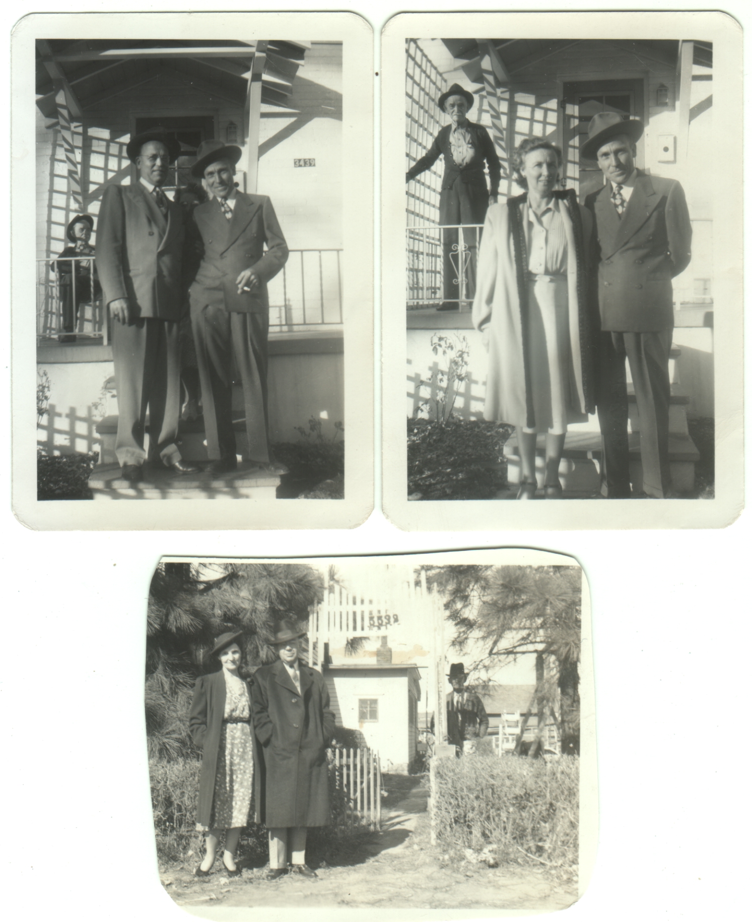 Three photos, ranging in size from 3 x 2.5 to 2.5 x 3.5 inches.  The bottom one has remnants of glue and black paper from having been mounted in an album.