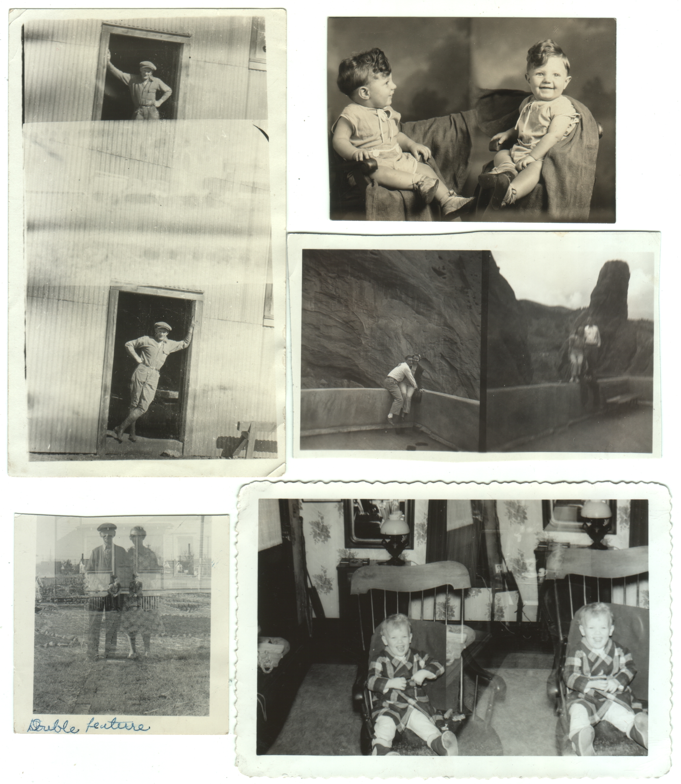 Top right photo is stamped with the name and address of Brownell Photo of Stockton, California. Bottom left photo has Double feature written on the front in pen. Bottom right photo has David Wm Hartwell Jr. / Mahwah / Age 2 1/2 written on the back in pen.