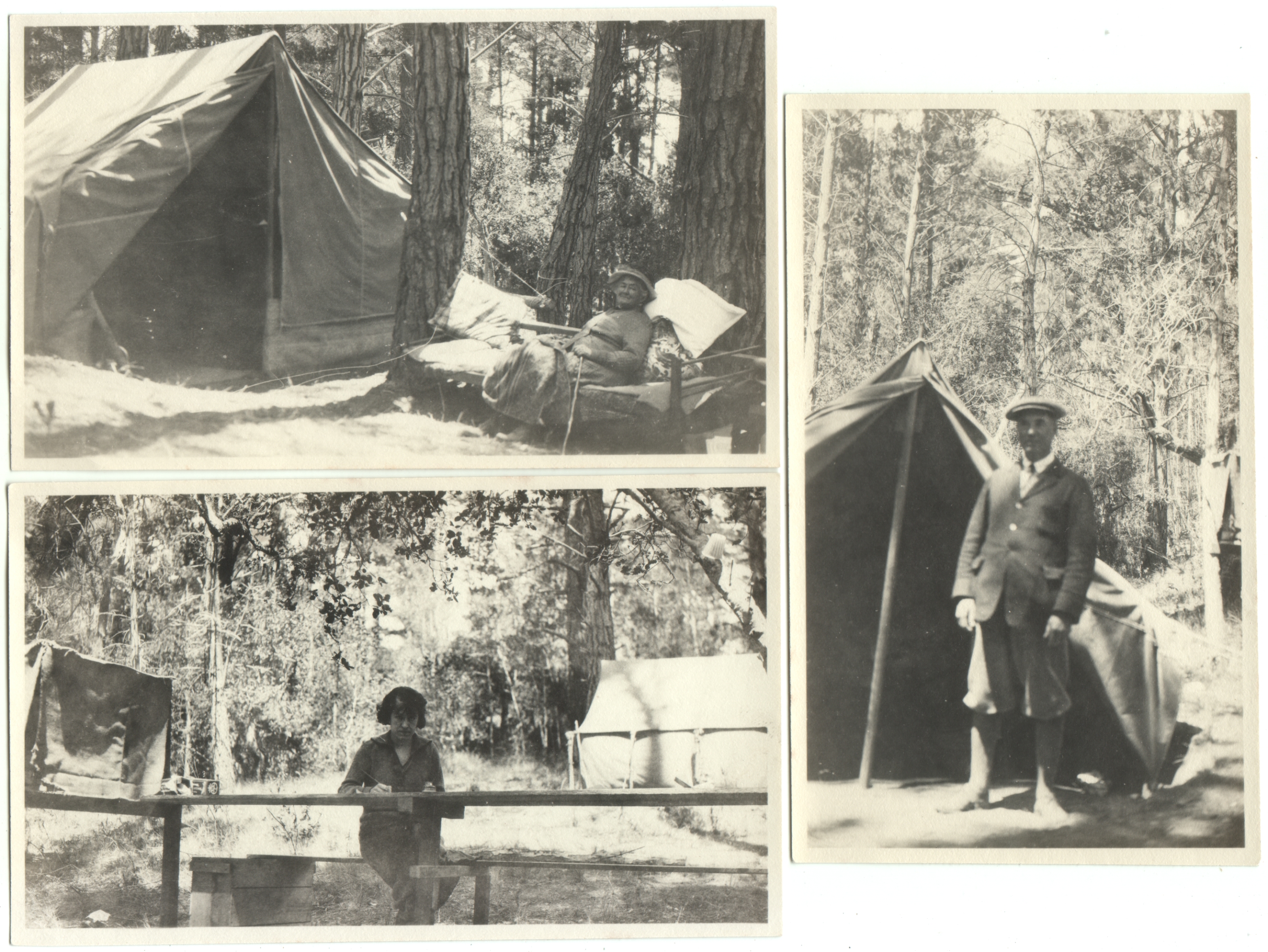 Here are three of seven photos of what I believe are the same camping trip. My initial reaction is always that they look rather coddled, lounging around in ways that resemble a stay in a hotel. But then I try to imagine erecting that enormous canvas tent and hauling around that furniture, and I realize that at least somebody was working pretty hard to make it a pleasant experience.