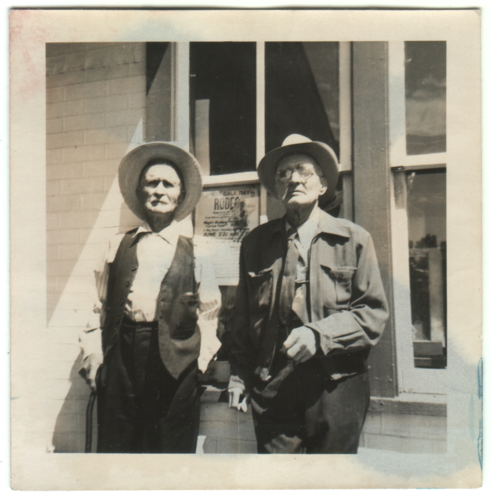 Old cowboys? Ranchers? I’m not sure who they are. Their standing in front of a rodeo poster might just be a coincidence, but I get the sense rodeos are nothing new to these guys. (By the way, the bluish stains are from the ink of the album paper bleeding through after getting wet, possibly from excess glue.)