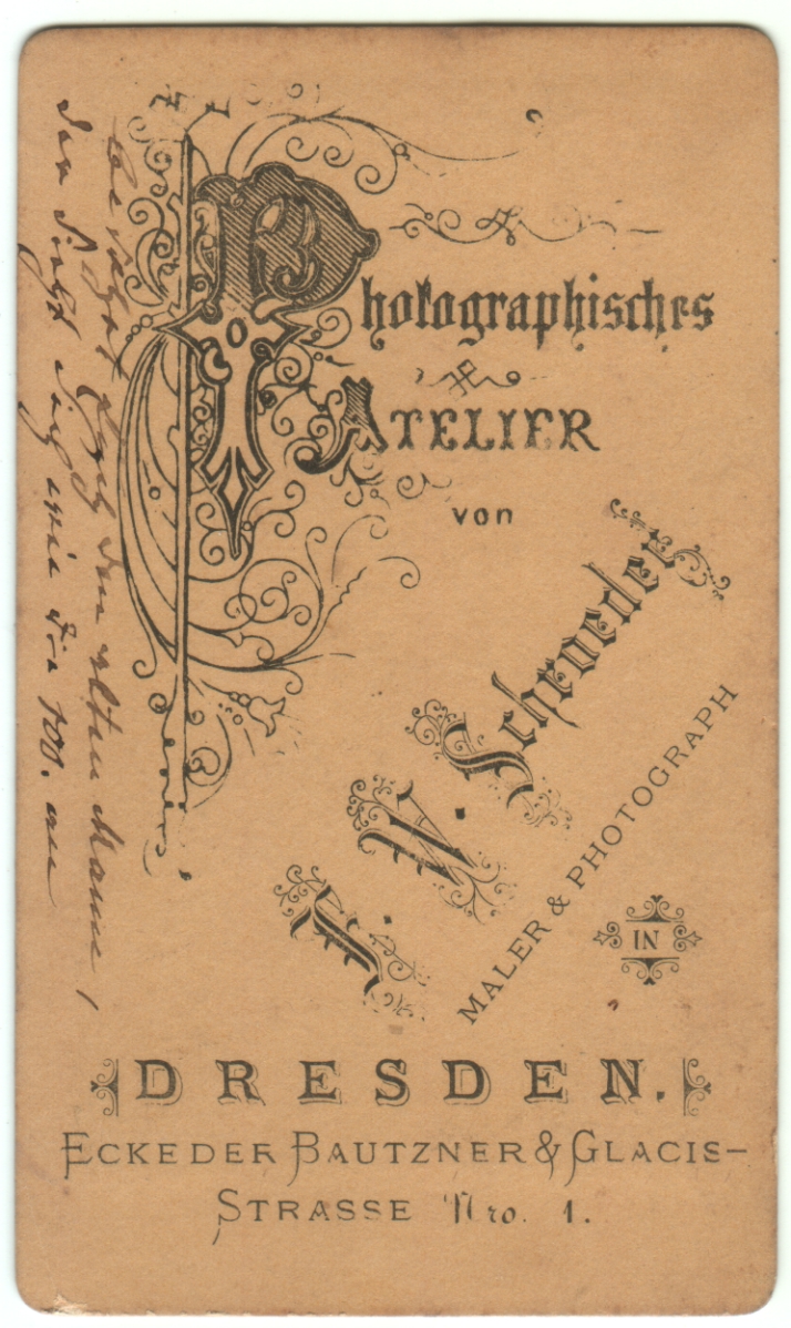 Photographer is F. W. Schroeder (painter and photographer) of Dresden. There is some handwriting in German that I can’t quite read. Click here to see it if you’d like to try to decipher it.