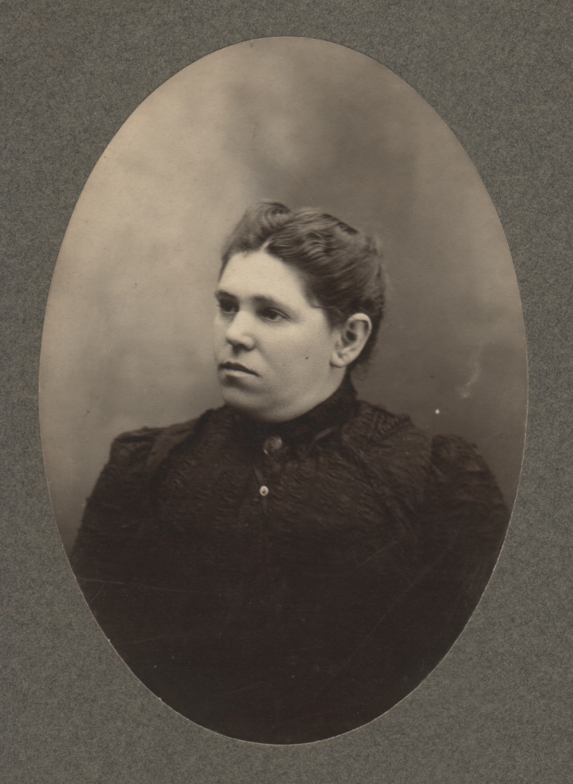 Photo (a bit less than 3.5 x 5 inches) mounted to a cardboard frame/matting (5 x 7.25 inches; I’ve cropped the distractingly stained edges of the cardboard from this scan).