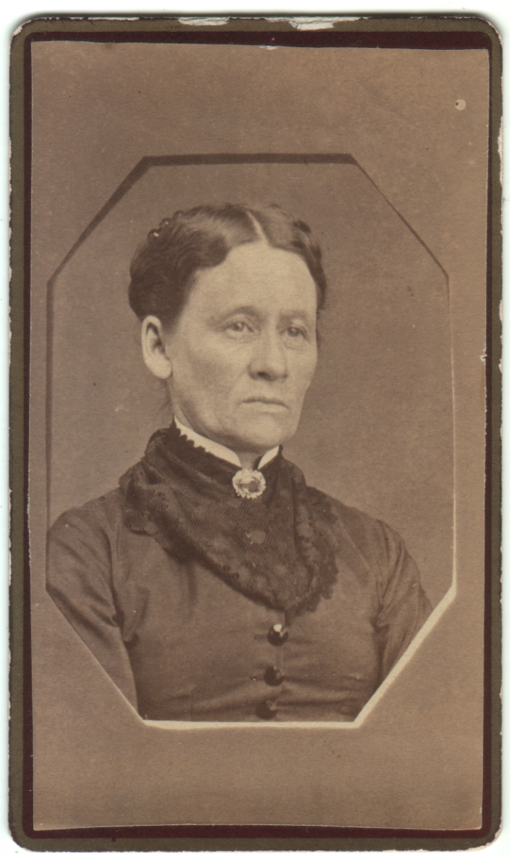 With the special effect of the border in the image, and the gold around the edge, this is surely not one of the earliest CDVs.  I can’t place my finger on why I feel this way, but to me she looks like a woman who normally wears glasses, but took them off for this photo.