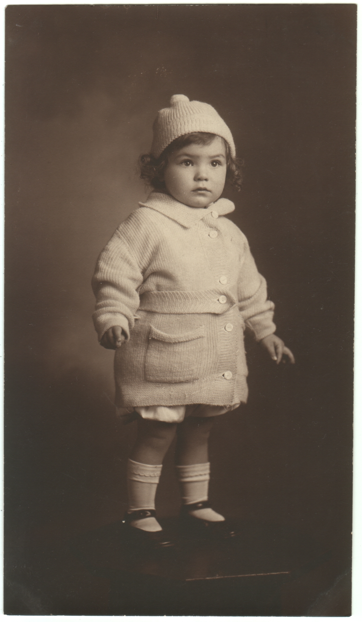 This is the second of four photos I bought this weekend. I’m going to try not to be lazy and post four baby pictures in a row, but I couldn’t resist this one. She’s just too cute. At first I thought the line in front of her feet was painted or chalked on the floor so she’d know where to stand. But when I enlarged the photo, I realized it marks the edge of a table she’s standing on. It’s hidden enough in the dark area of the photo that I didn’t notice it at first. That would explain why she looks like she’s trying to stay balanced.
