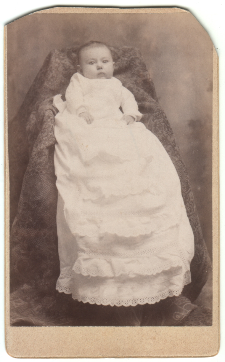 This is another of the photos my mother gave me.  By coincidence, it is the same photographer as the one here, though they came to me from different sources.  I’m guessing this is a christening gown.  It’s so gloriously voluminous that the baby looks almost like an afterthought.  Though I see no obvious evidence of a fastening device or a hidden mother, it seems fairly certain that this baby is wedged securely into place for the photo.