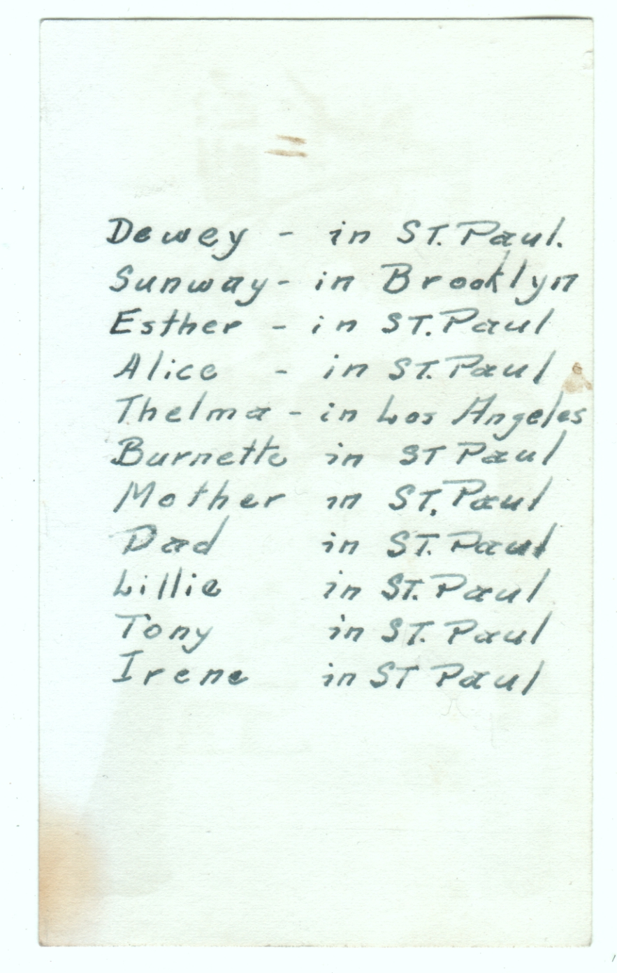 I’m guessing this is some sort of family gathering, and based on the information on the back, I’m guessing it’s in or near St. Paul, Minnesota. But what struck me most about this photo is how much everybody looks alike, particularly how all the women look like the old woman in the middle.