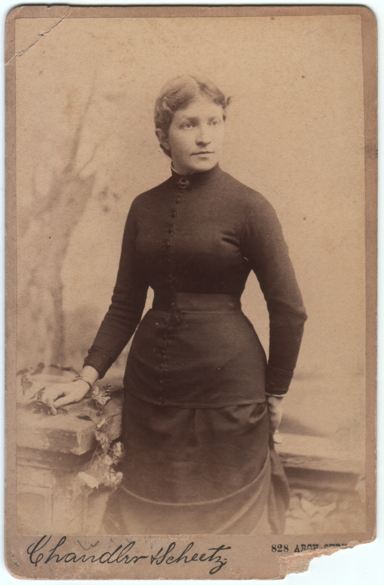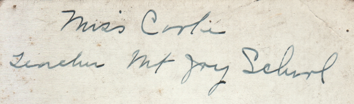 Photographer is Chandler & Scheetz of Philadelphia, Pennsylvania.  Written on the back is Miss [name] / Teacher Mt Joy School.  I can’t quite make out the name.  Corlis or Coolie or something.  Click here if you’d like to try it yourself, and let me know what you think it is.