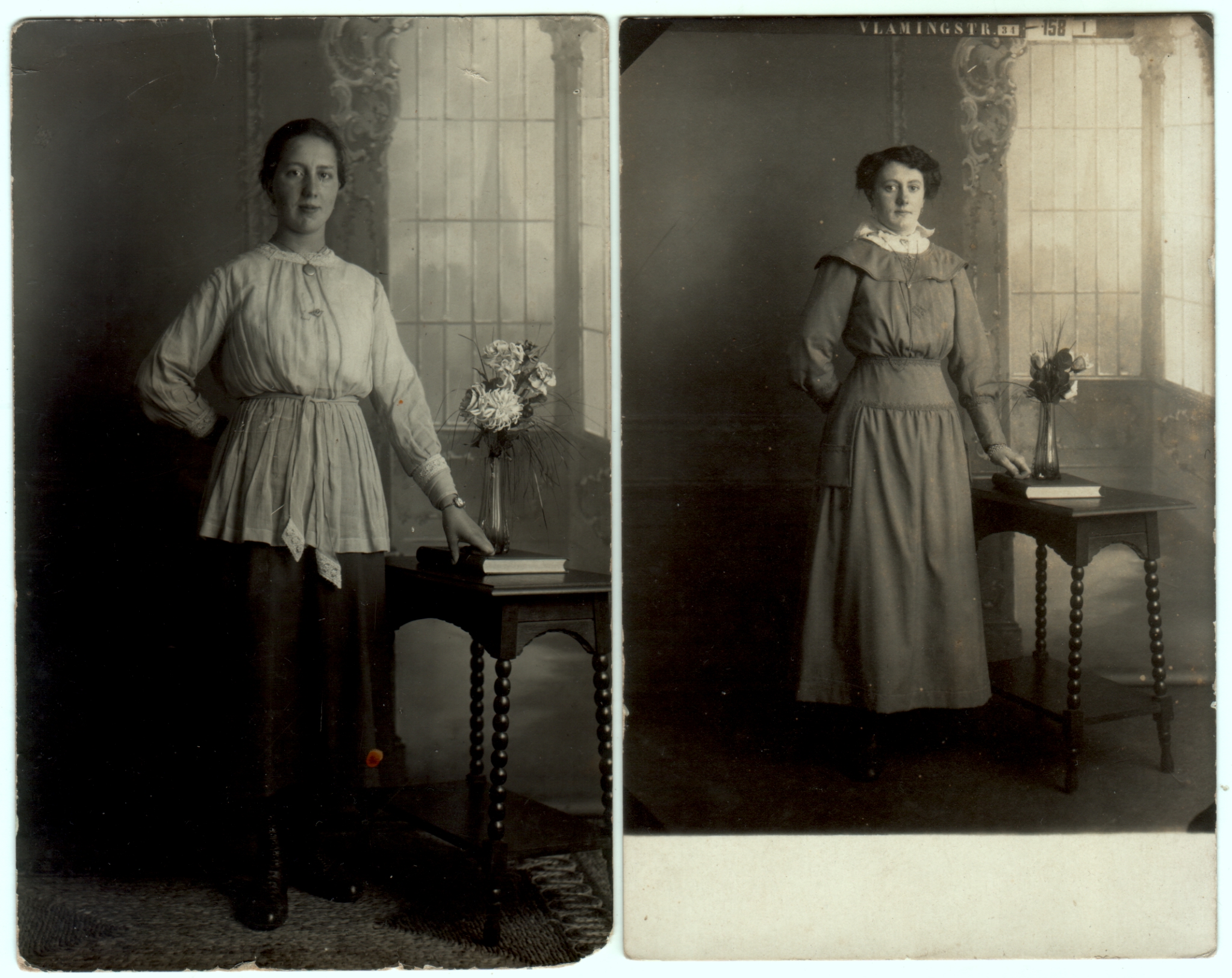 Here is another example of two different people who obviously went to the same photographer to get their portraits done.  (They were sold to me together, among a batch of others from the Netherlands, but I don’t know whether they are related in some way, or if it’s just a coincidence.)  The setting is the same, and the pose is the same.   Interestingly, though, I looked at these photos multiple times before I recognized the connection.  I suppose it’s the way they are framed differently that threw me off at first.  Perhaps also because the women’s outfits look so different.