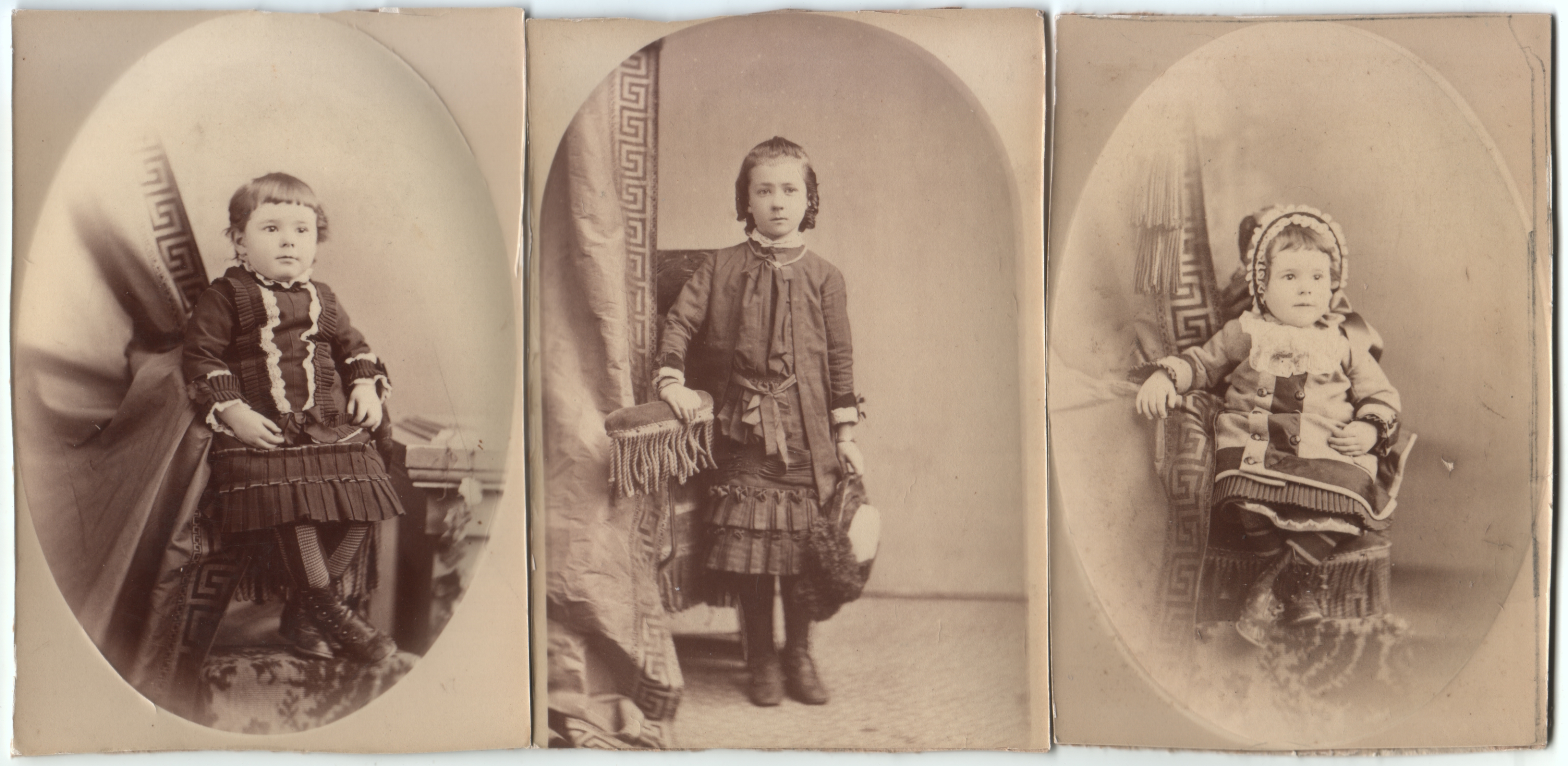 Actually, the photographer’s information on the back of the center one is completely obscured by remnants of whatever it had been mounted to, but it seems fairly obvious that these three photos were taken at the same studio, since the drapery and the chair are the same.  There’s a raised quality to the centers of the photos (it looks like ovals or an arch in the scan) that made me assume they were framed, but it may be some trick of assembling the photo with which I’m not familiar.  As for these adorable children, I wonder if they are related.  The two on the ends look similar enough that they could almost be the same person, thought they’re probably siblings.  And the stiff poses of the children and the positioning of the curtain make me assume the two on the ends are being held in place, either by some sort of posing brace, or the hand of a hidden person.