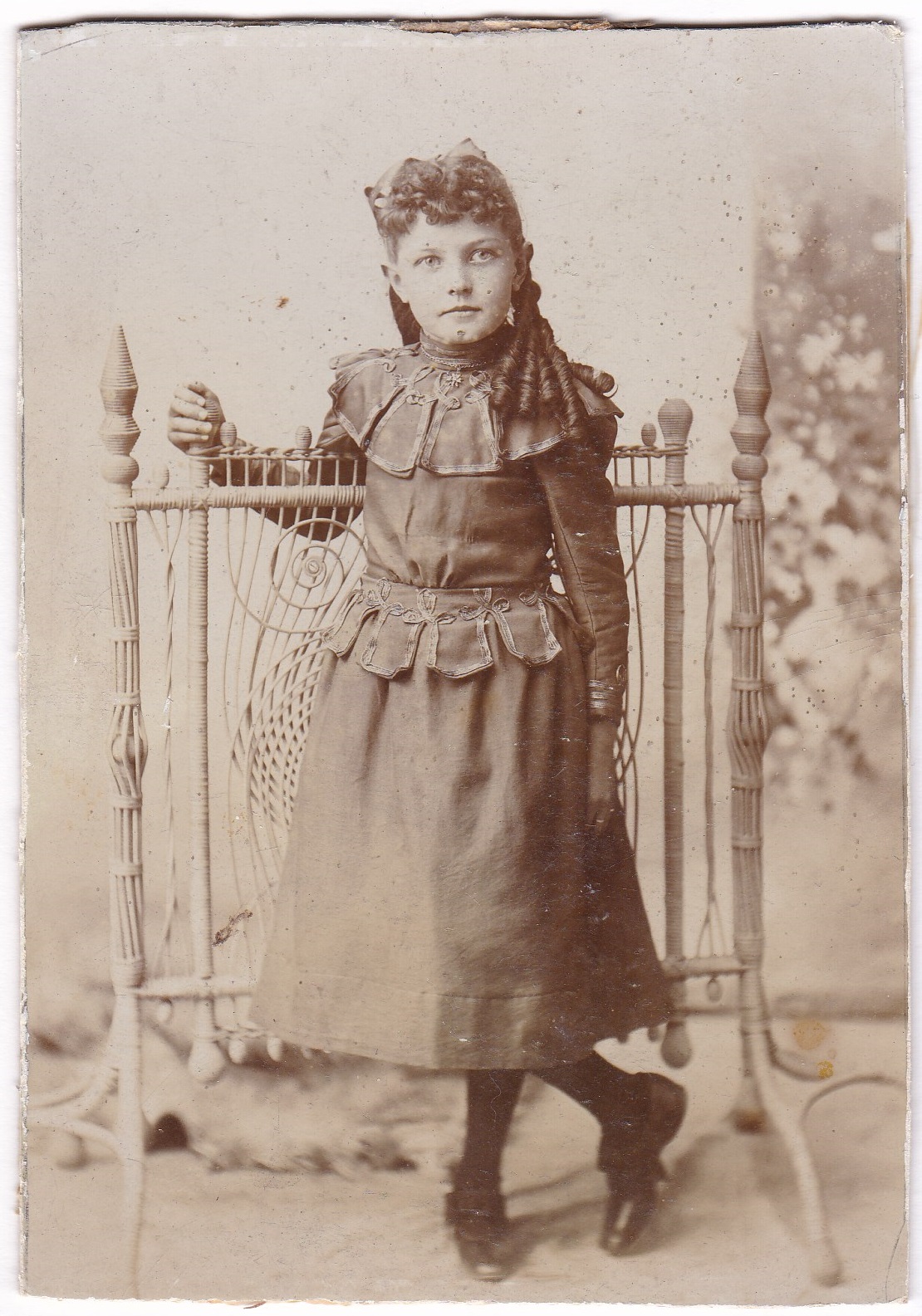 I don’t recall seeing this sort of ornamental railing or partition used in a photo before.  In fact, I’m not even sure what to call it.  Are any of you familiar with it?  As for the origin of this photo, I can tell you it was purchased on eBay together with the photos shows here.   The other three photos clearly belong together, but this one isn’t such an obvious match.  The setting is different, the child looks different, and while the others have a matching sepia tone and that weird oval imprint, this one is more blue-gray, and smooth.  Nevertheless, they are all trimmed to roughly the same size, and they have similar traces (including tape) of having been mounted to something.  Perhaps this girl is one of the others at a different time and place?  There is a slight resemblance, after all.  Or perhaps photos of far-flung grandchildren were collected and mounted in the same way by the same grandparent?  Perhaps it’s just a coincidence?  I’ll probably never know, but it’s fun to speculate.