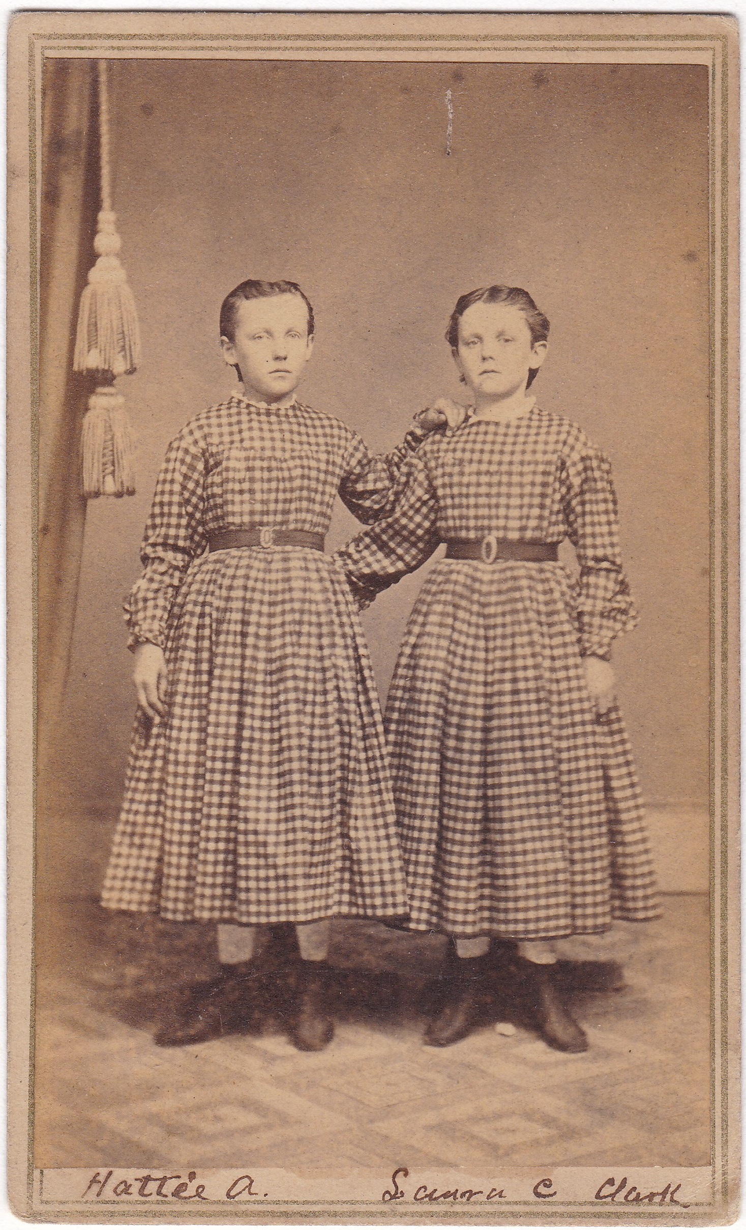 The other day, idle at work, my fingers wandered over to eBay and bid on an inexpensive bunch of as-is photos, my first eBay photo purchase in about fifteen years.  They arrived yesterday, and I’m delighted with them.  (Well, most of them.)  Here is an example.  Are these two twins?  Surely at least sisters, right?  Someday I might bother to subscribe to a genealogy website, but meanwhile some simple internet searching didn’t turn up anything obvious for these two.  (Plenty of name matches, but not with matching sisters, and not the correct ages for this era.)  That includes searches for “Harriet” instead of “Hattie”.  And the vintage handwriting threw me off, because I was searching for “Sarah” before realizing the name is actually “Laura”.  In any case, even without knowing anything about these girls, I think it’s a fun image.  By the way, note the clever way the bases of a pair of posing stands are hidden in the shadows of their dresses.