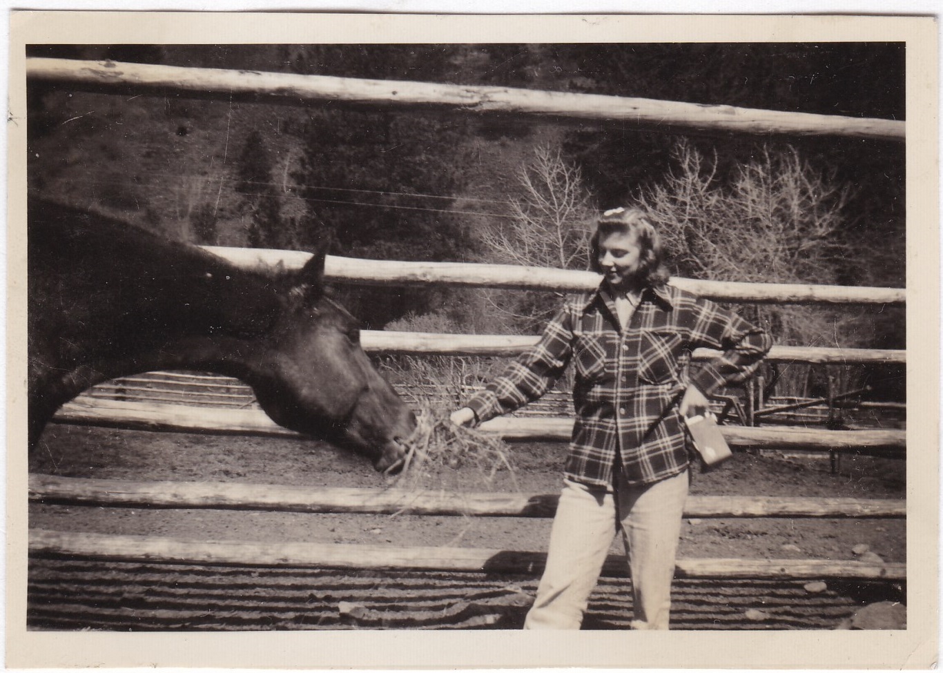 I thought, even looking at the small photo I held in my hand, that this was a visually striking image. The horse leans in so that its head and neck are running parallel to the fence rails slashing across the image. They run counter to the woman’s bold upright pose, her arm akimbo, standing there in a way that almost stops the motion of the image. And the depth of the background gives the whole thing a full feeling. At least to me. I’m not sure what the woman is holding in her left hand, but I think it might be a camera, which means that at least two people felt this occasion was worth documenting. It makes me wonder what other images from that day I’m not seeing.