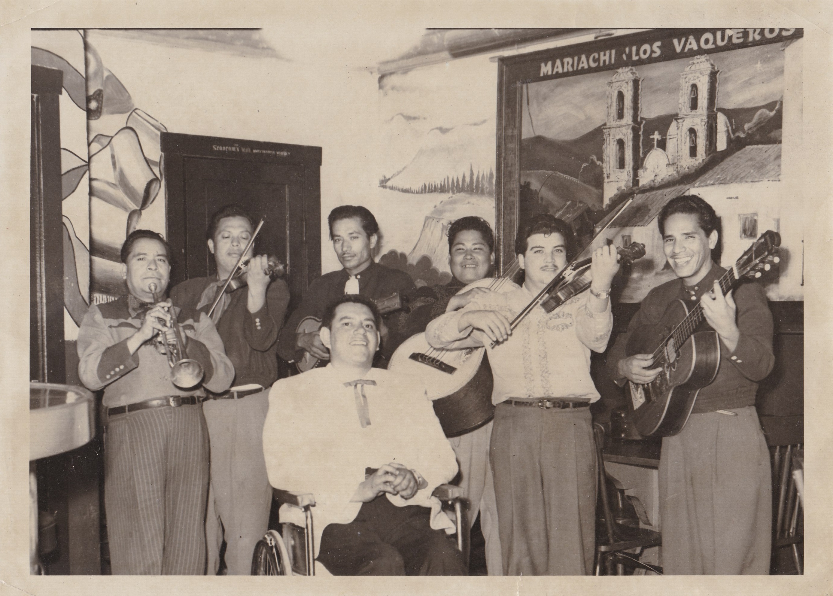 I would love to see this in full color. Are these the resident musicians in this particular nightspot? Is Mariachi Los Vaqueros the name of the place? The name of the band? Both? Neither? (A quick internet search shows multiple bands with that name, past and present.) Is the man in the wheelchair a member of the band, or perhaps somebody being celebrated with music that evening? Whatever the situation, it looks like a fun scene. (By the way, the writing over the door appears to be one or more ads pasted there. I can make out the first word as “Seagram’s” and the last word as “whiskey”.)
