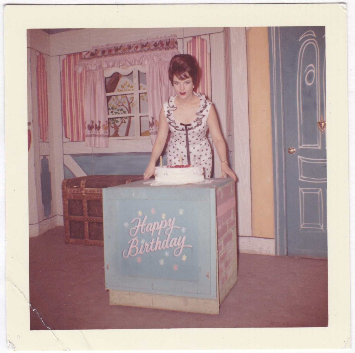 Today is my birthday, and one of the things I did to treat myself was to visit the nearby bookstore that sells old photos and splurge on a bunch.  I don’t quite know what’s going on in this picture (is that the set for an amateur play? is the cake part of the play? if so, is it a fake cake used as a prop?), but I could hardly pass up such a fun, colorful photo, especially today.