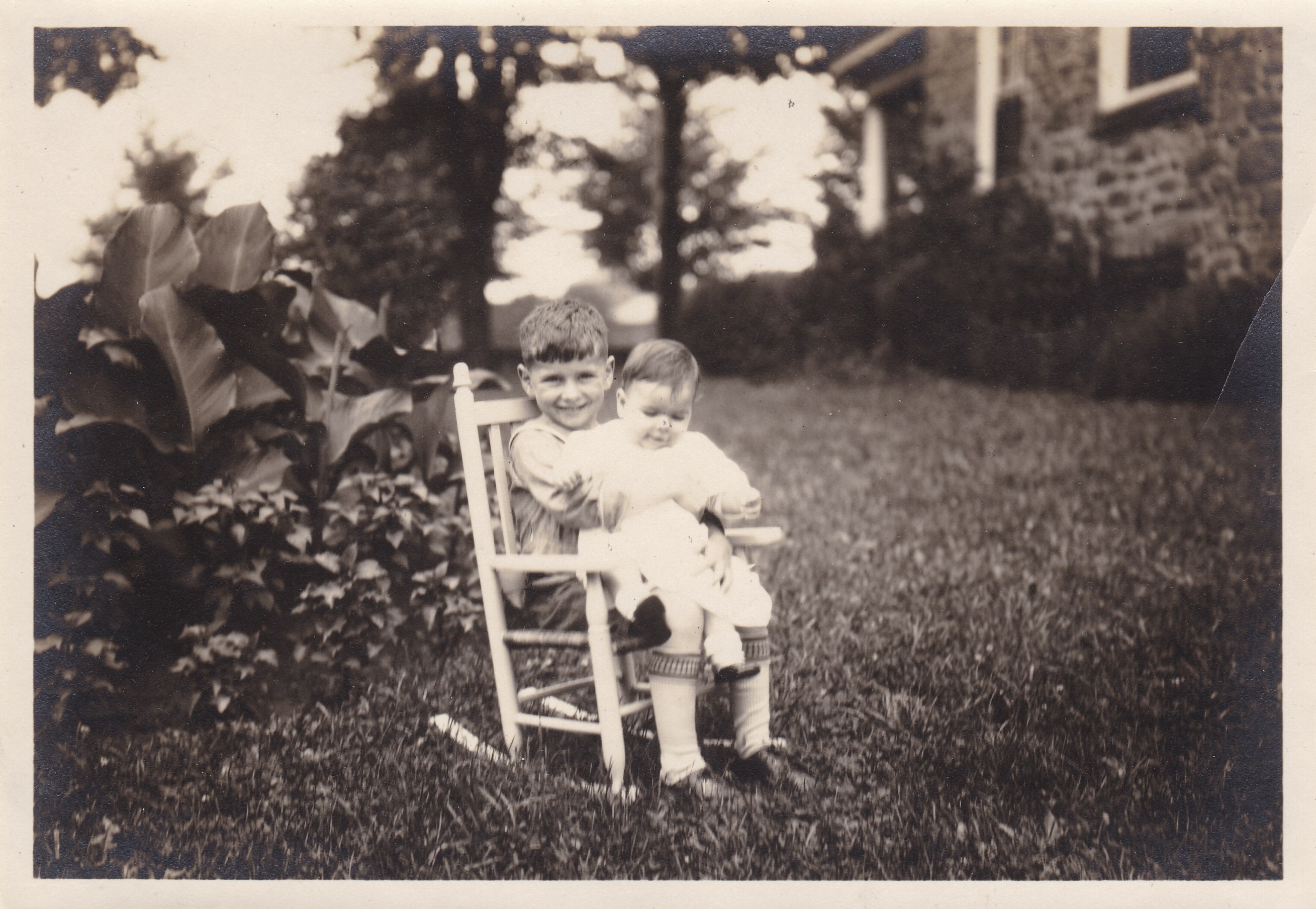 This is certainly the same yard, with the same large canna (plant) in two of the pictures, and appears to me to be the same two children, but the boy is wearing different socks in the picture with the chair. Perhaps a different day, or perhaps he managed to get his feet wet.