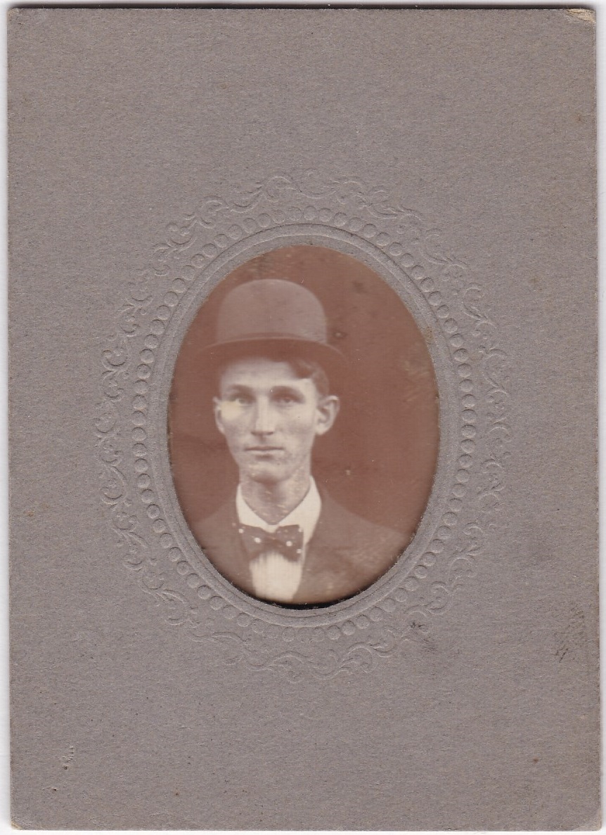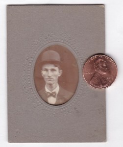 I continue to be surprised by how small many of the photos in my collection are.  Not that small photos are so strange, but I think of tiny photos as designed to fit into a locket or wallet, rather than to be mounted in a separate frame like this one.  I feel there’s something sweet and intimate in a tiny framed photo like this.  I also wonder about the origin of this photo.  It appears to be a candid photo, rather than a studio portrait, and without tearing the whole thing apart, I can’t tell whether this was meant to be the finished product, or if his face was trimmed out of a larger composition.  I’ll admit, part of the charm of this photo is the polka dot tie, combined with the flat-brimmed derby hat, which I can’t help associating with Stan Laurel.