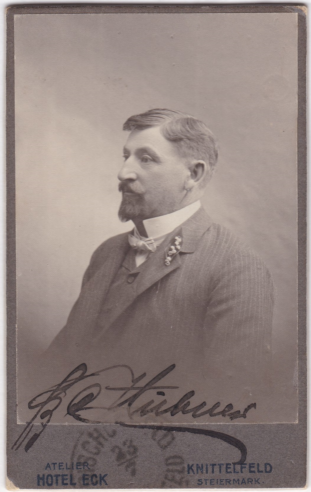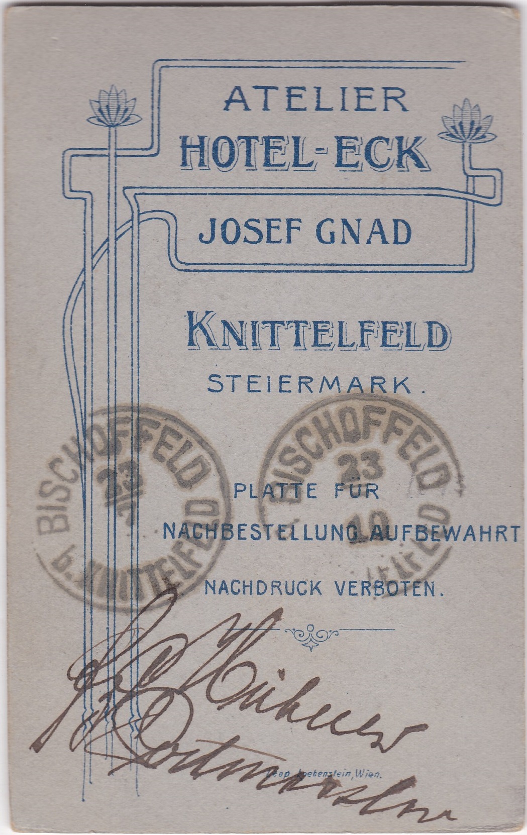 I usually try to figure out as much as I can about a photo before posting it, but since my readers have demonstrated that they enjoy contributing to the research, I’ll start sharing more of the ones that have stumped me. This is an example. Hopefully you, my readers, can help me fill in the blanks of my understanding of it. Here’s what I know: This is a photo taken by Josef Gnad at his studio in the Hotel Eck in Knittelfeld, Austria. (Steiermark is known in English as Styria, and is a state in lower Austria.) Printed on the back is a notice that negatives (“plates”) are kept for future prints, but that reprinting is forbidden (presumably by anybody other than Mr. Gnad). Also, the card with the attractive graphic design showing the photographer’s information, onto which was pasted the photograph to create the carte de visite, would have been purchased by the photographer from a purveyor of such supplies, and at the bottom of the back you can see that that seller was Leopold Loebenstein of Vienna. So then my questions: Who is this man? The signature on the front suggests (but doesn’t prove) that he’s somebody of some significance, but I can’t read the writing. Maybe Hickner or Hirkner? And why is the name repeated on the back? What is that extra word on the back? It almost looks like Postmeister (Postmaster), which might explain what appear to be postal cancellations on both sides, though it doesn’t quite look like that, and even then it doesn’t make particular sense to me. In the United States, there were revenue stamps used on the backs of photos for a period in the 1860s, and those were sometimes cancelled, but that doesn’t seem to be the case here. As for the cancellations, is the date July 23, 1910? Is that date related to the photo, or to something else? I may have an elegant portrait of the old postmaster of Knittelfeld, but it’s just as likely to be something else. In any case, it’s yet another opportunity to look back across time at a man I’ll never otherwise know, and if he felt good enough about his portrait to autograph it for someone, I’ll say I agree.