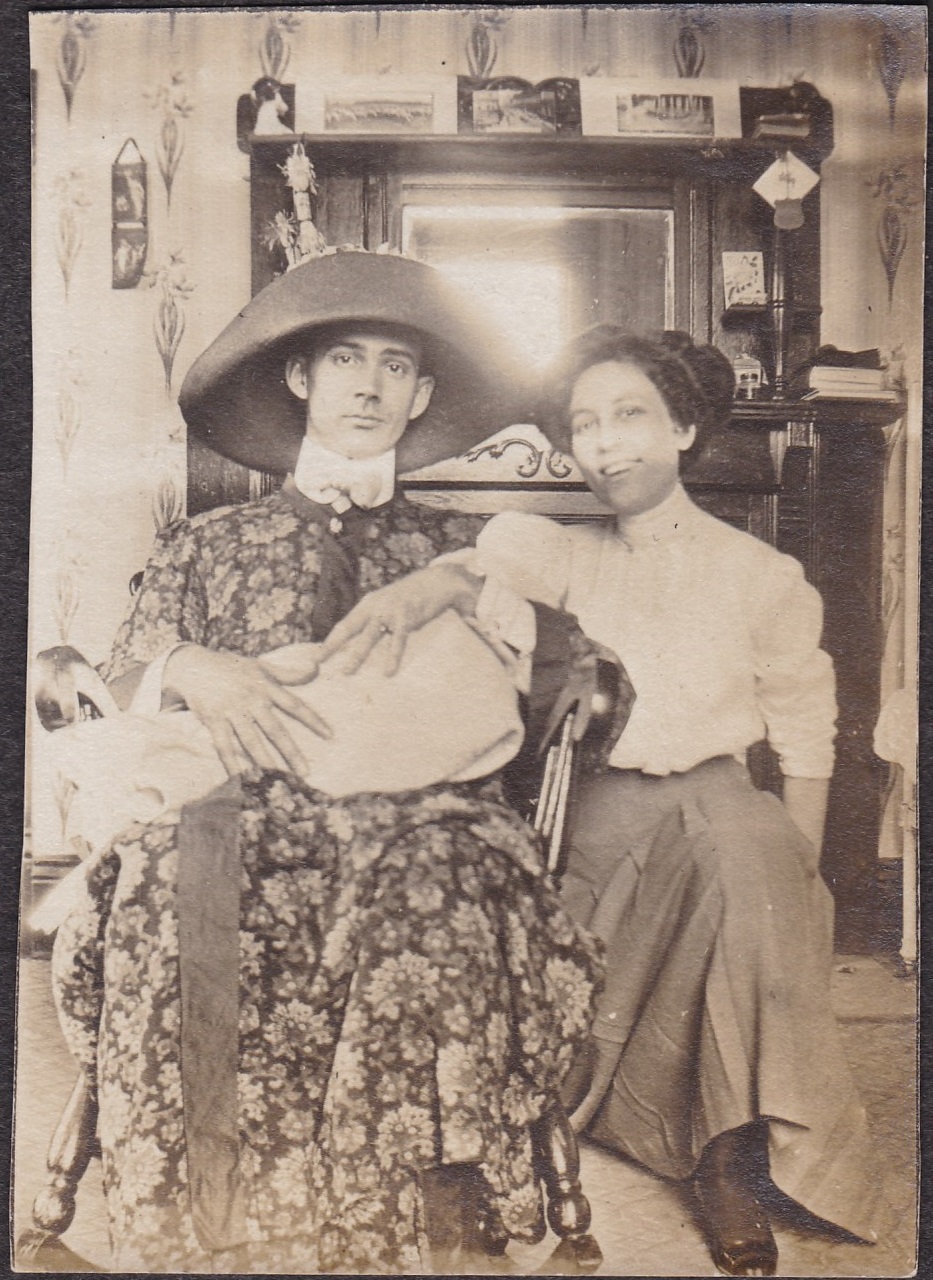 1. I love her smile–and his deadpan expression! Dressing up in drag must have been “a thing” many people did for fun, because the photos do show up for sale from time to time. Great find, Christine!