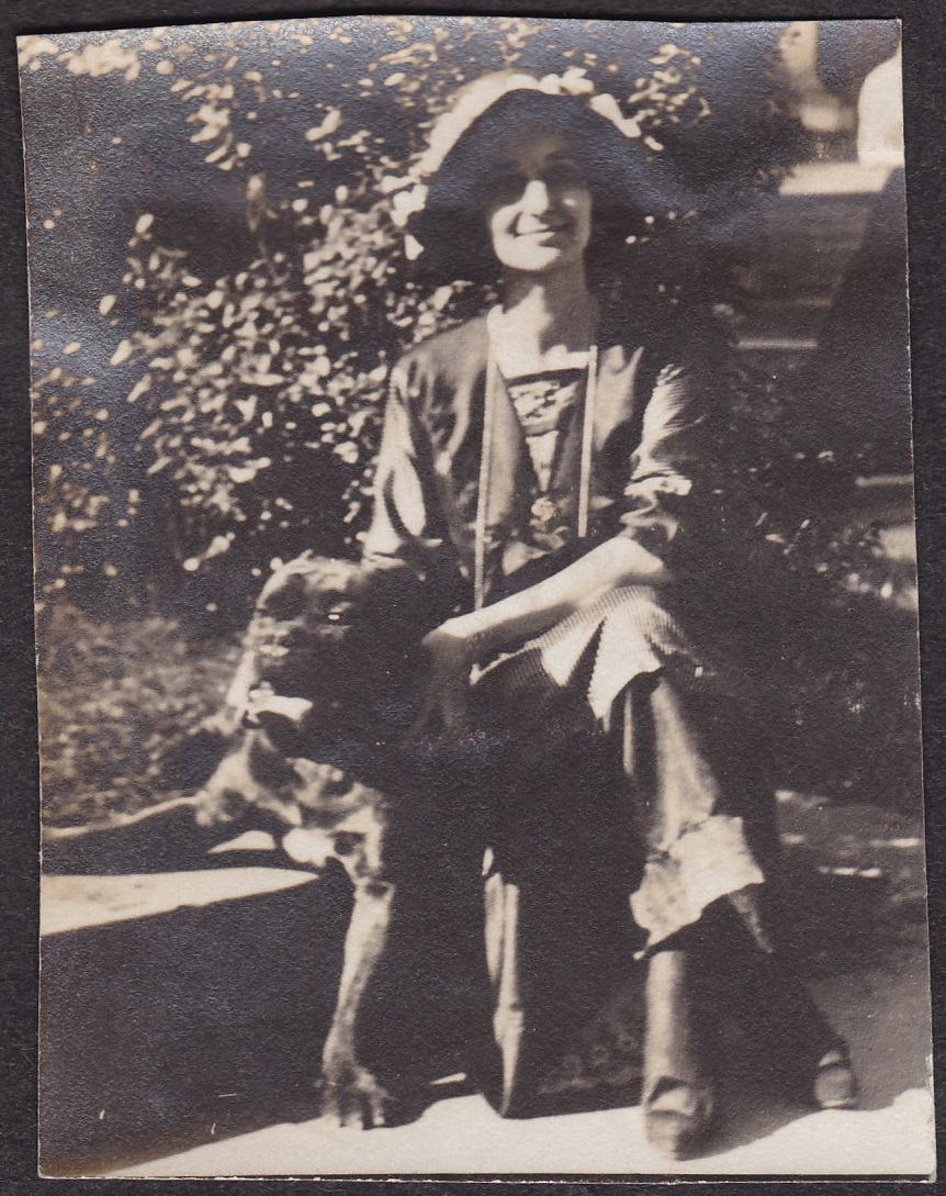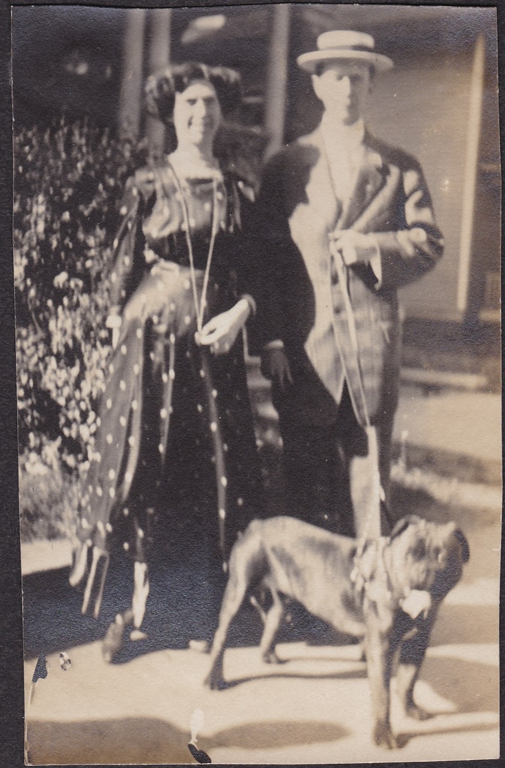 This was a gift my friend Christine (“harriedcostumer”) gave me a while ago.  As far as I can tell, that’s a man in drag, pretending to be (or maybe actually) holding a baby, while a delighted woman enjoys the moment with him.  Am I seeing that right?  Is it Halloween?  Some private fetish?  A production of “Charley’s Aunt”?  I have no idea, but the riddle of this image intrigues me, and I love how happy they seem.  I’m also sharing the other three photos that were pasted to this album page, partly because I think the woman sharing the moment with the man in drag may also be the woman in the other photos wearing the hat, though I’m not sure.  Either way, it seems they knew how to enjoy life.  Bonus:  there’s a dog!