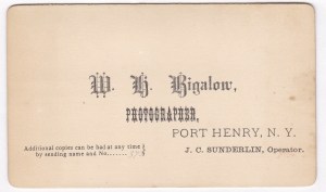 Photographer was the studio of W. A. Bigalow in Port Henry, New York, operated by J. C. Sunderlin.