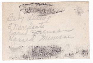 Written on the back in pencil is Baby sitting / 2 Marchants / David Ferguson / Harold Minerve. I’m actually guessing on that last name, See this scan if you’d like to take a shot at deciphering that handwriting.