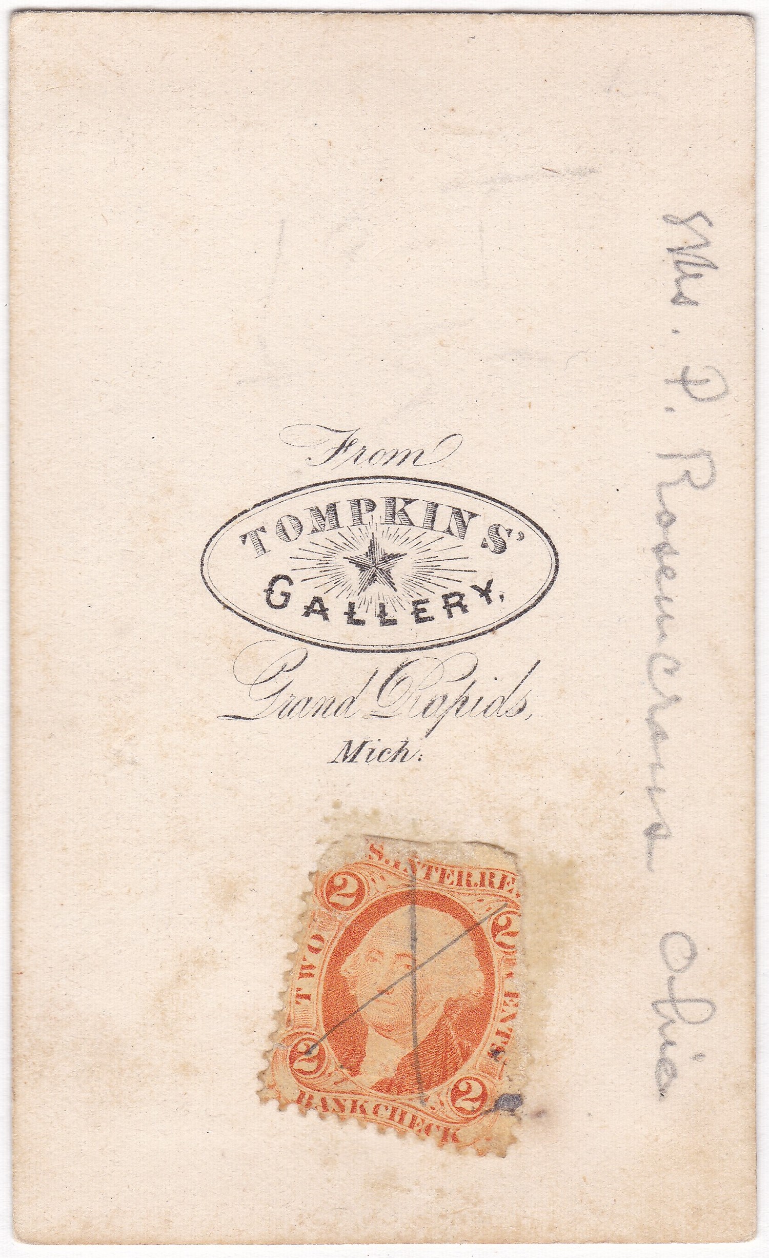 Here’s another photo I got this weekend at the book fair. It’s another CDV (Carte de Visite, measuring 2.5 x 4 inches). Since the comments in yesterday’s post turned to the topic of revenue stamps on the backs of photos, I thought I’d share one of the four I just bought. These stamps were a tax imposed during the Civil War to help fund the war effort. Photographers were required to add the tax to each photo they sold, verifying that the money was paid by sticking a stamp on the back of the photo. The amount of the stamp depended on how much the photo cost. In this case, the 2-cent stamp means that the photo cost 25 cents or less. Since the stamps were only used from August 1864 through August 1866, that means this photo is from that two year window.
