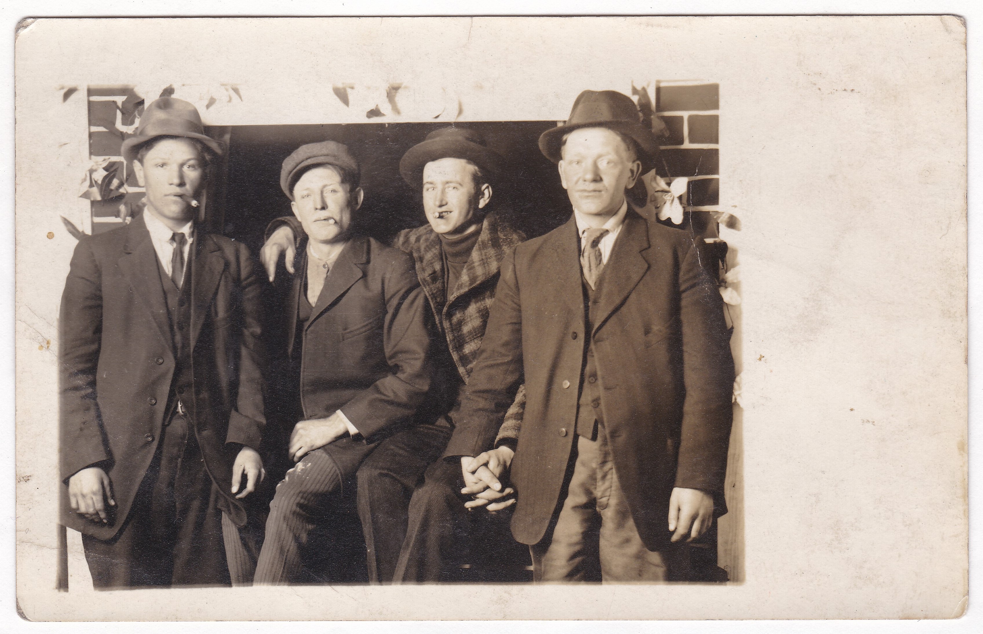 Yesterday’s post showed two men in what is sometimes referred to in vintage photography circles as an “affectionate pose”. It’s a term that gets thrown around especially when two men are deliberately touching each other in a way that seems intended to show a special bond, perhaps between close relatives or very good friends, or, sometimes, between people whose bond is more romantic. In this picture, we have some young men who seem to have no trouble displaying affection for each other, which I like. I don’t know who they are, or what their relationship is to each other. But I’m intrigued by some elements of the picture. What is the setting? The foliage appears to be artificially attached to a wall of painted-on bricks. Are these friends gathered on a photo studio set? Are these actors on a stage set? There’s an almost make-believe bravado to the way they’re posing with cigars in their mouths. It was printed as a real photo postcard, though the big margin on the right suggests the photo wasn’t originally taken with that in mind. The paper manufacturer’s logo on the back (Noko) narrows the date range to 1907-1920s, which I would have guessed, anyway. Like yesterday’s photo, this postcard is unmailed, but includes a name in the address area, in this case “Mr. James Anderson, Mandan, N. Dak”. If memory serves, the two images came from the same dealer at last week’s book fair, but I’m not sure if the fact that they are both addressed to people in North Dakota is anything more than a coincidence. UPDATE: I somehow missed what appears to be a paint smudge on the pant leg of the guy second from the left, which gives added weight to the idea that this is the setting for some sort of theatrical endeavor.