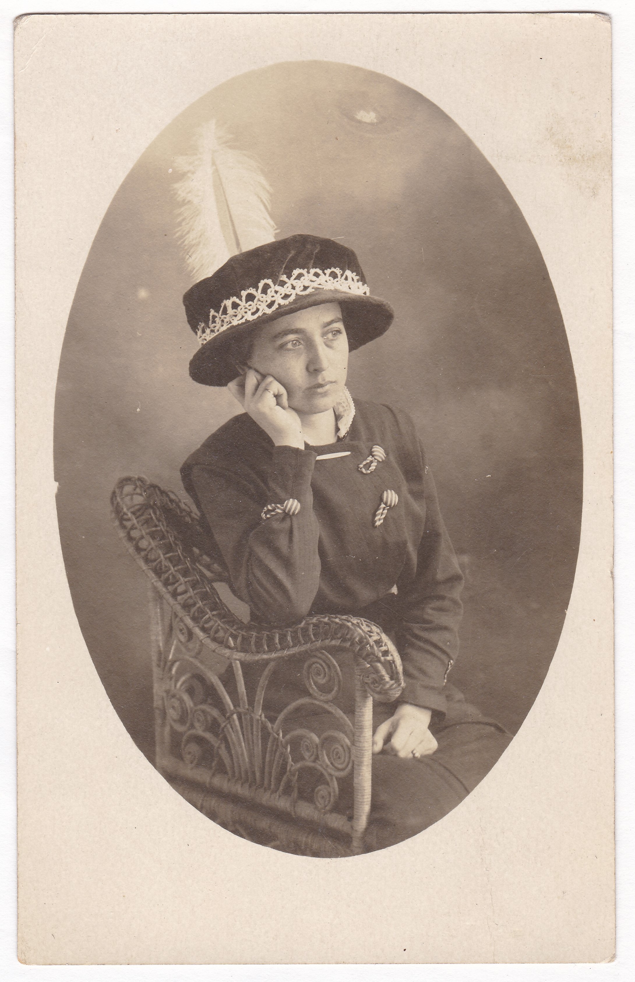 I was looking online to see if there was a name for this particular style of hat, so I could call it something other than “large”, but I didn’t find anything. Admittedly, I didn’t look very hard. If somebody knows, I’d be happy for the information. Meanwhile, I was impressed by how well-lit her face is, considering the hat. Somebody once taught me the trick of looking at the reflections in the eyes to see the direction of the light source, and that works here. The photographer seems to know what they’re doing. This is, by the way, a real photo post card, with no identification or other information. The paper manufacturer’s markings (AZO, four corners pointing up) narrow the date range to 1904-1918, which seems to match the fashions presented here.