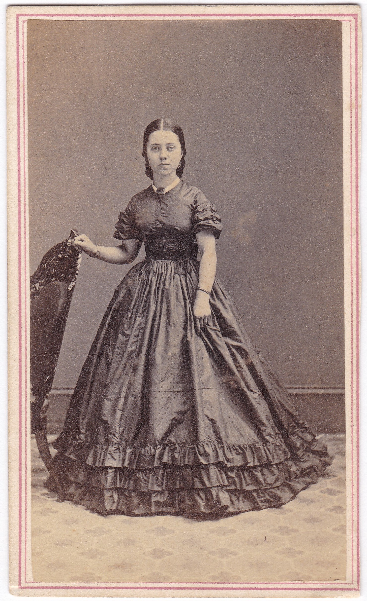 I love the simple directness of this one, and the way the clarity of the image lets us look back through time at the way she’s confidently looking back at us. The photographer is R. A. Lewis, 152 Chatham Street, New York. I believe that’s Robert A. Lewis, as discussed here. He was a successful and prolific enough photographer that you can now find quite a few examples of his work online. That makes it fun to compare and contrast. For instance, the pictures here and here appear to show the same chair (though not the chair above). And he uses the same decorative column in photos here and here and here and here.