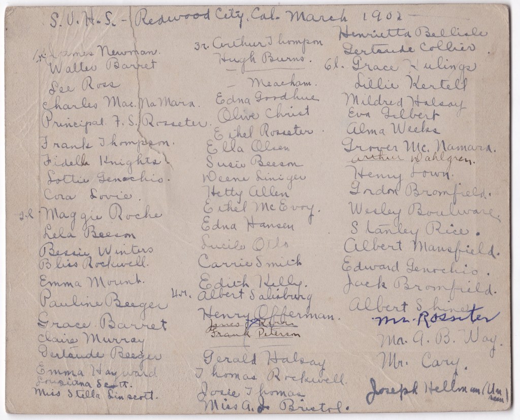 This photo is from a box of photos and other items that seems to be from the estate of a woman named Edna Hansen (or the estate of someone very close to Edna). Sure enough, Edna is one of the people listed here, though I haven’t quite figured out which one is her. Sequoia Union High School, in Redwood City, CA, was founded in 1895, so by the time this picture was taken in 1902, it would still have been rather new. (It is now called Sequoia High School, and has moved locations.) Wikipedia says it was founded as a preparatory school for Stanford University, and sure enough, Edna went to Stanford, got her Master’s in Latin in 1909 (I have the commencement program), and became a school teacher in Northern California (I believe in Willits, and possibly other places). I’m not sure Edna would ever have expected details of her life to be presented for public display like this, but as somebody who enjoys examining the lives of others, I’m grateful that she bothered to document her life as she did.