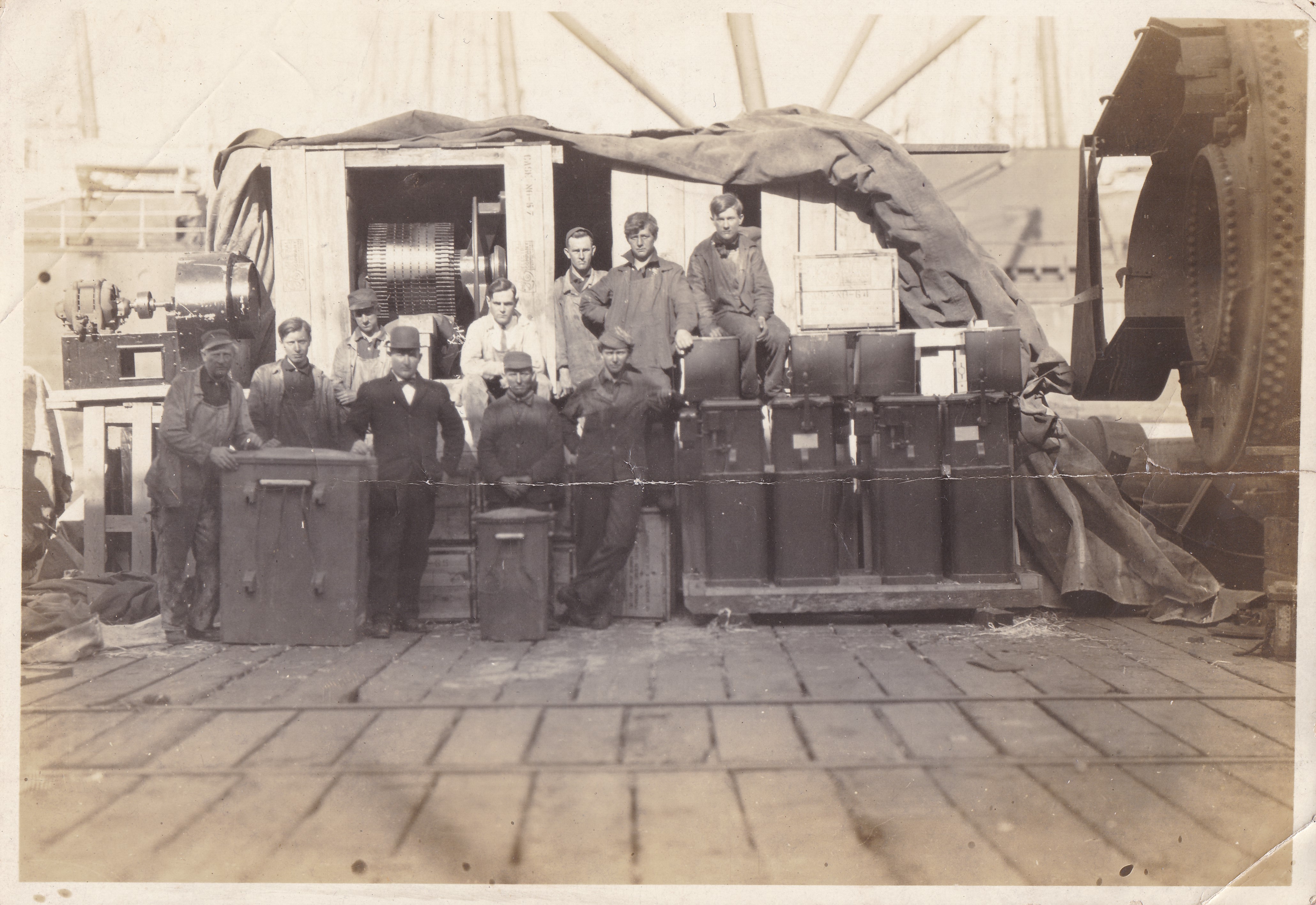 They were manufactured here in the US This is a photo of a team of workman trained at installing a power system or electric substation . They are heading off on a voyage ( on a ship) to install the transformers, magneto and steam boiler to electrify a town or small government in South America or somewhere in the Pacific Ocean. The man in the bowler hat is the representative of this city or nation that purchased the substation.