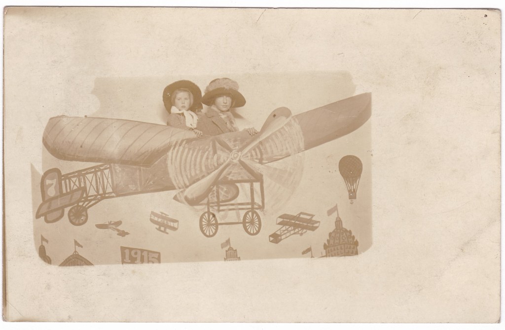 This one is a bit faded, but I love it anyway, so I’m sharing it. It’s a real photo post card that has no information except the paper manufacturer’s insignia (AZO, four triangles pointing up), which narrows the date range to 1904-1918, though I’m guessing the “1915” in the image itself is accurate. I’m assuming this is a novelty souvenir photo from a fair or something similar. It’s printed on the postcard in a slapdash way that suggests it wasn’t given the usual standard of care of a proper photo studio. Here’s what it looks like uncropped: