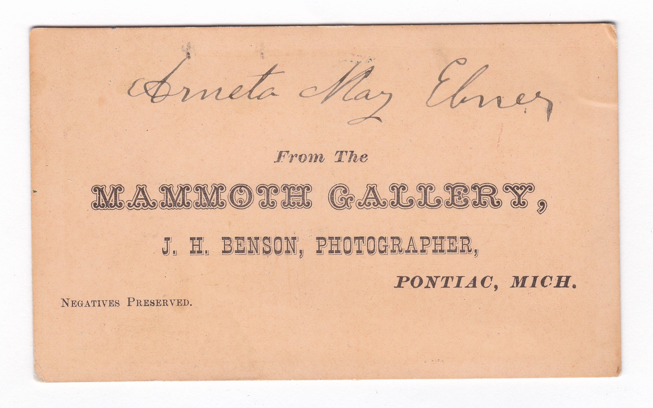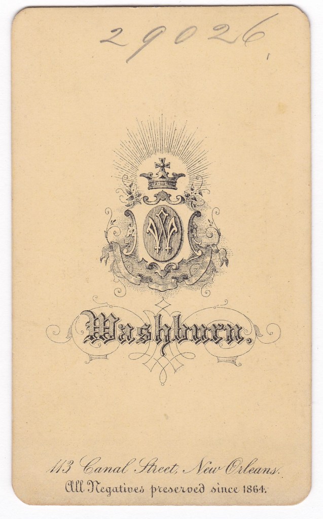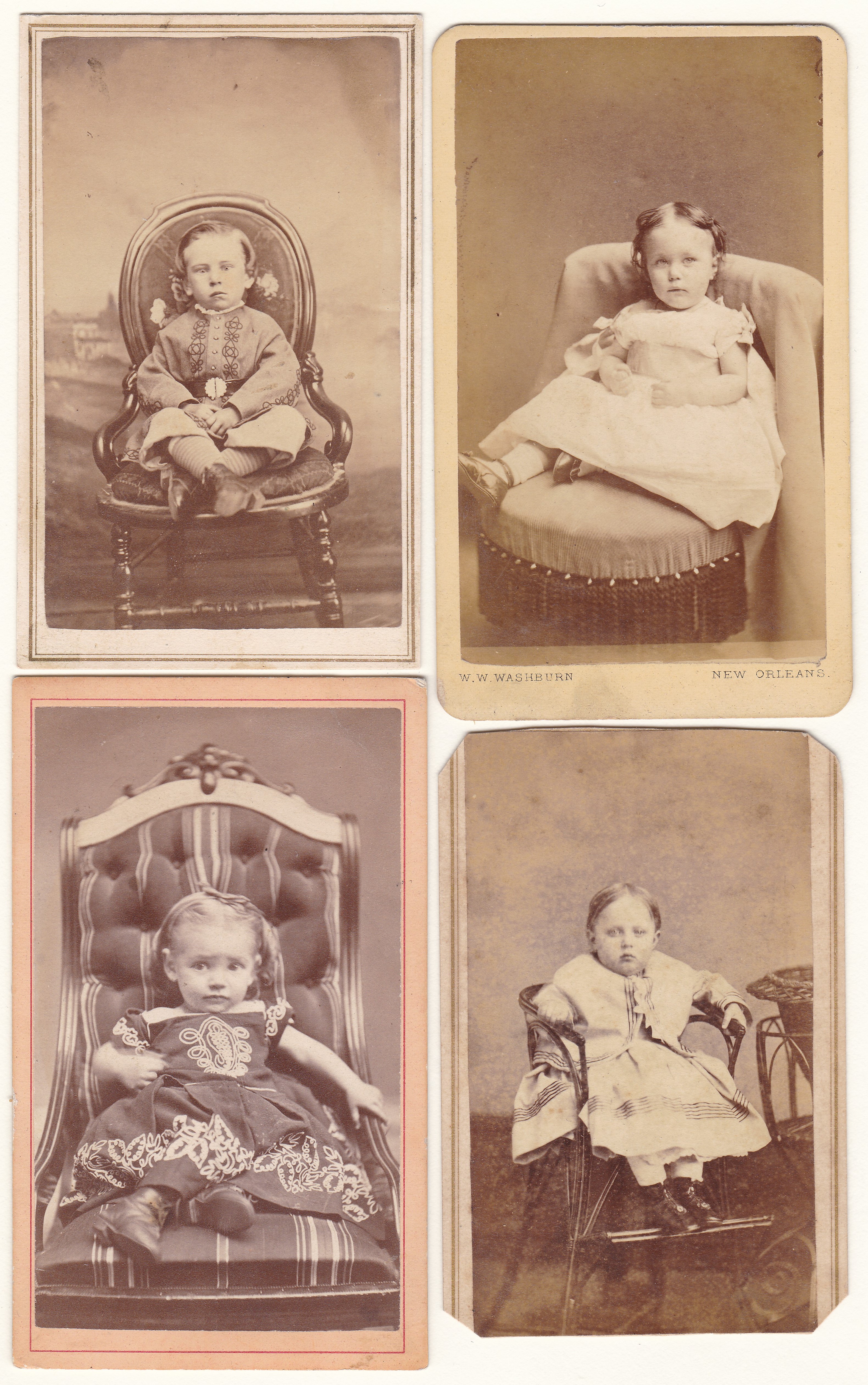 I couldn’t decide which of these little cartes de visite to post, so I decided to just post them all. It’s always interesting to compare and contrast. I think we’ve got two boys (upper left and lower right) and two girls. I think the boy pictures are the oldest. The two kids on the left look the least comfortable, and the expression on the boy in the upper left is downright alarming. (I think the pupils of his eyes may have been touched up, inadvertently contributing to his glare.) The variety of chairs is interesting, and I love examining the details of all their outfits. The boy pictures come with no information. The girl in the lower left appears to be named Arneta May Ebner (if the name written on the back is indeed hers), and the photographer is J. H. Benson of Mammoth Gallery in Pontiac, Michigan. The photographer of the upper right photo is W. W. Washburn of New Orleans.