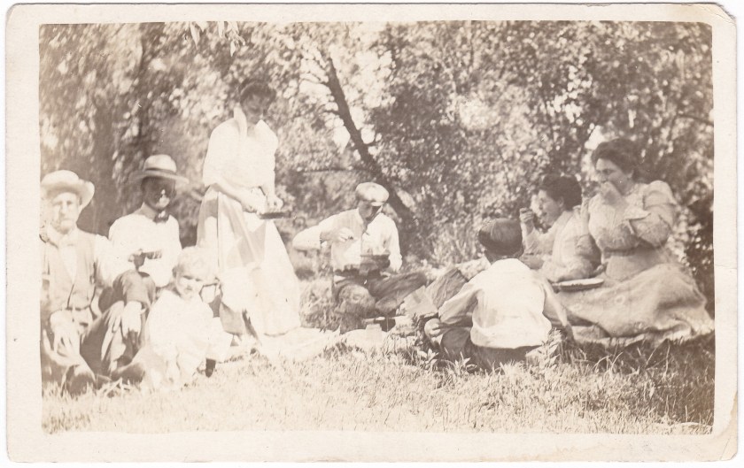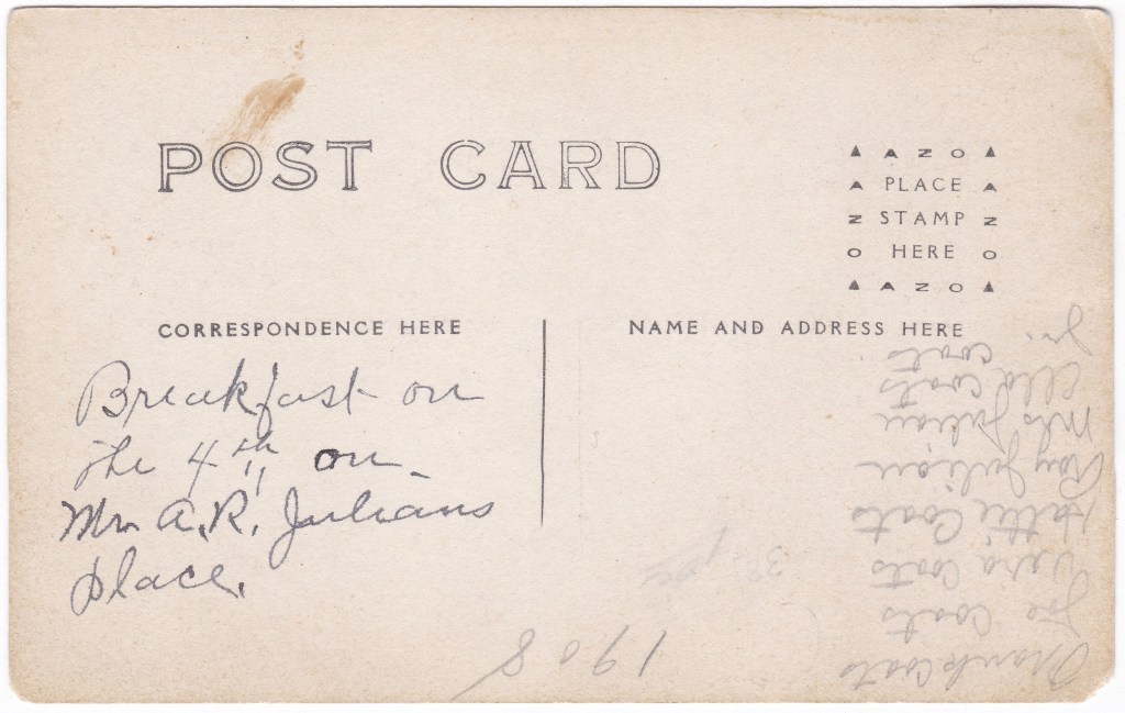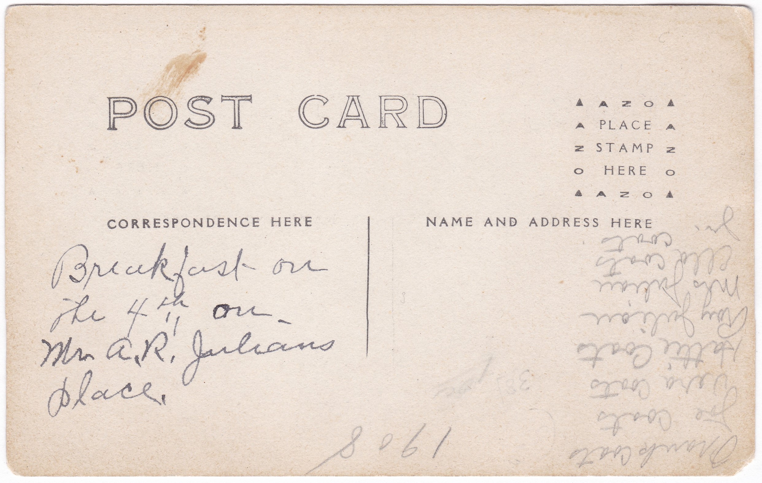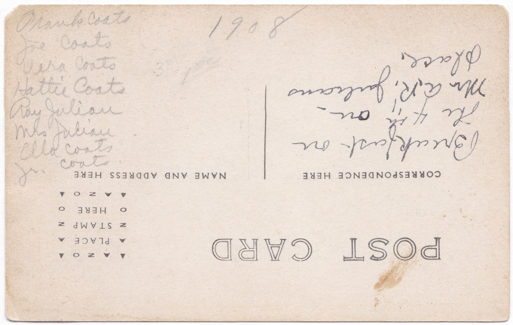 This is such a peaceful scene. The washed-out quality of the image might be viewed by some as a flaw, but I think it gives it a dreamy quality. Combined with the fact that only three of the eight people seem aware of the camera, it gives me the impression of a candid moment captured, full of unforced serenity, looked at through the haze of nostalgia. Of course, the impression of nostalgia may be partly because I’m looking at it across a distance of more than a century. I wonder how the people felt about it then. (Did people then wish the image was clearer? Was the guy in the back pleased to have been captured shoveling food in his mouth?) This is a real photo post card, and the paper manufacturer’s markings (AZO, with four triangles pointing up) date it to 1904-1918. Somebody wrote on the back, dating it to 1908. Also written on the back is “Breakfast on the 4th on Mr. A. R. Julians place”. Is that the 4th of July, maybe? Also written on the back is a list of names, presumably of the people in the photo. (Frank Coats, Joe Coats, Vera Coats, Hattie Coats, Ray Julian, Mrs. Julian, Ella Coats, Jr. Coats.) So shall we assume the Coats family was visiting the Julian family? Were they related? Friends? Neighbors? Did they travel far? Were they there for more than breakfast? Who was the anonymous photographer? Below you can see the writing on the back. Since it was written in two directions, I’m posting the image twice [click to enlarge].
