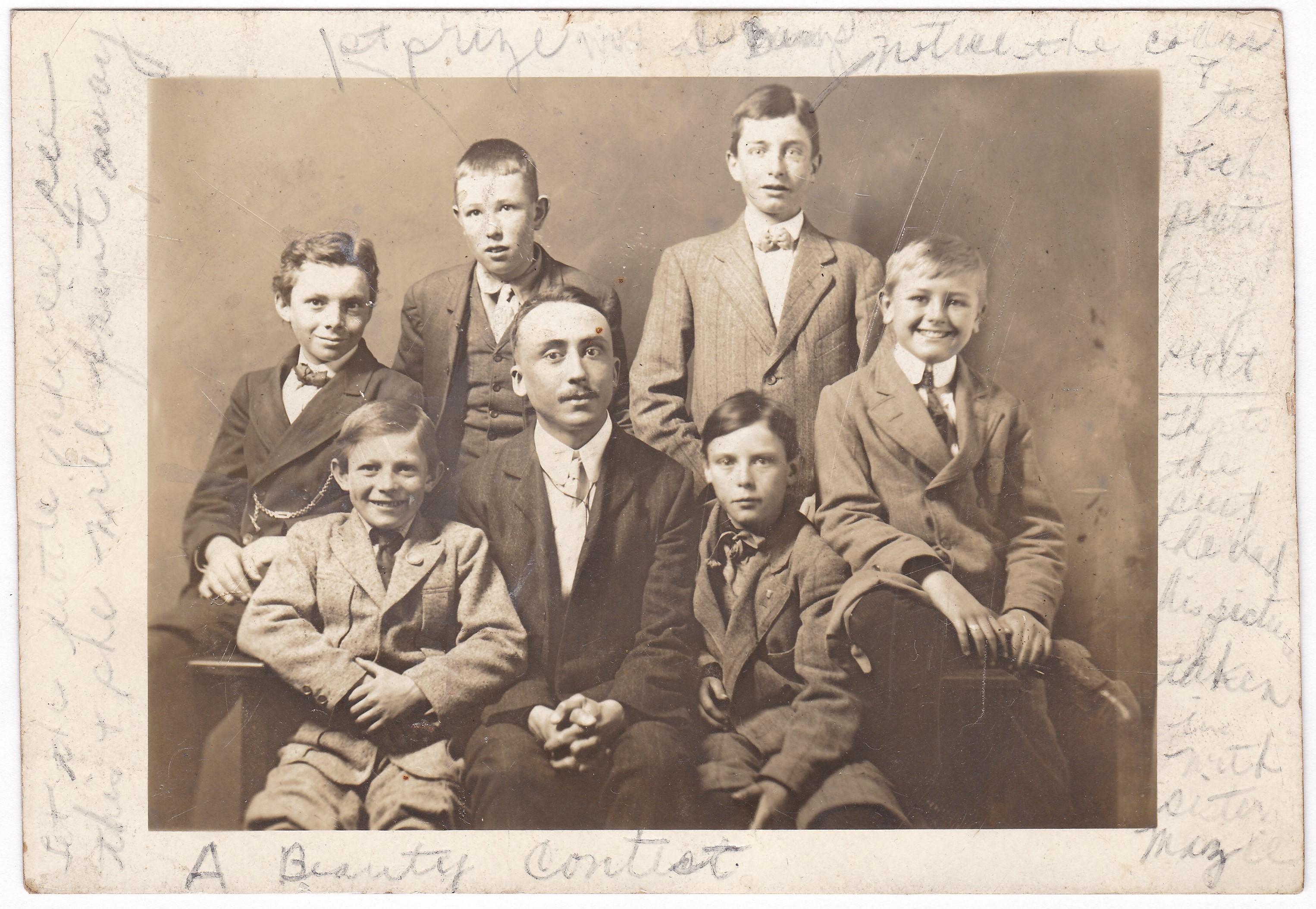 I was looking through my photos with half a mind to find one appropriate for Father’s Day, when I pulled this one out, though I think it’s more likely a photo of a teacher with six students than a man with his six sons. It’s a real photo post card, with the paper manufacturer’s markings (AZO, four triangles pointing up) dating it to 1904-1918. Printed on the back is “1311 Fillmore St, San Francisco”, which an internet search indicates was a photo studio called the Premium Postal Studio. As you can see, somebody felt the need to annotate this image. Along the bottom is written “A beauty contest”. Along the left side is written “Let the little nurse see this and she will faint away.” Along the top and down the right side is written “1st prize the [illegible] Notice the collar + tie + the pretty gray suit / that’s the suit he had his picture taken in with sister Mazie”. That last note is pointing to the kid standing in the upper right, though they all look well turned out to me. The man appears to have something hanging around his neck and tucked into his jacket pocket. I’m not sure what that is. What I especially like about this picture is the way they are all carefully posed, and yet they all appear to be relaxed and having a good time.