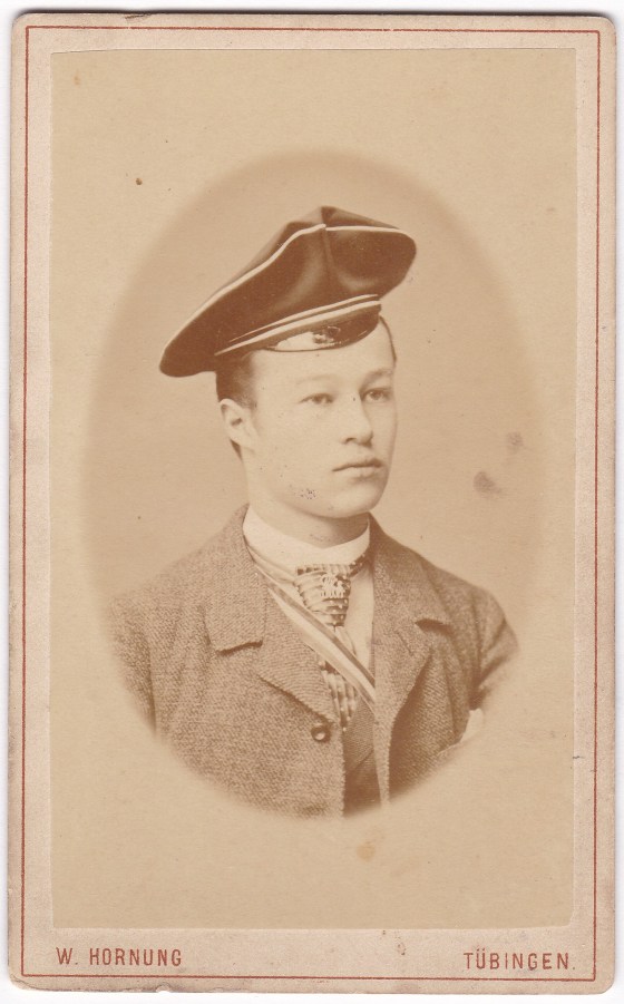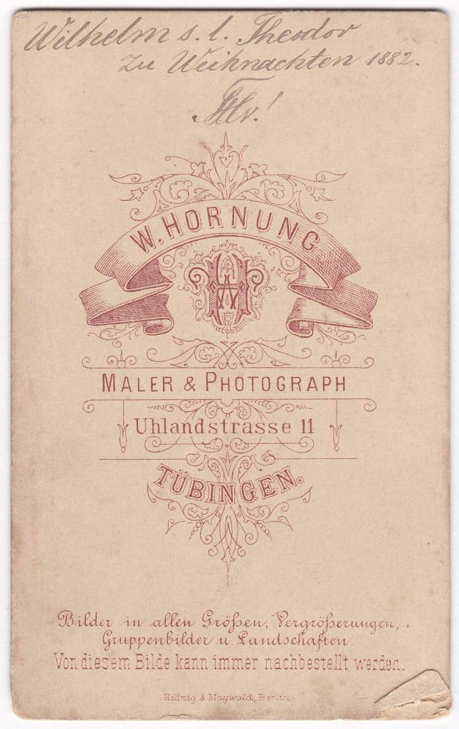 What intrigued me about this little carte de visite image is the young man’s outfit, the unusual hat, the sash-like strip across his chest, and what appears to be a tie pin with letters I can’t make out. I was having a hard time trying to figure the ensemble out, when I took a chance on searching for other images by the same photographer (W. Hornung of Tübingen, Germany, who I believe to be Wilhelm Hornung, 1834-1884). Sure enough, I found other young men dressed similarly, such as here. And most helpful was the one here, a page that identified the look as belonging to members of the Corps Franconia Tübingen, a sort of fancy university fraternity still in existence today. In fact, on their current website here, you can see a picture of men in the same sashes looking at pictures of men dressed like our guy. The only difference (and this threw me off at first), is that our guy seems to have done something non-regulation to the shape of his hat, pinching it at the front in a way that gives it a different shape. Otherwise it seems the same. Also, here’s the back, which gives us a bit more information. It tells us that the photographer is also a painter (“Maler”), and it has an inscription that indicates the photo is being given for Christmas of 1882 (“zu Weinachten 1882”). Incidentally, when held in my hand, that inscription looked like it was written in pencil. But once I enlarged it, I could see it was written using a pen with an extremely fine tip. [click to enlarge]