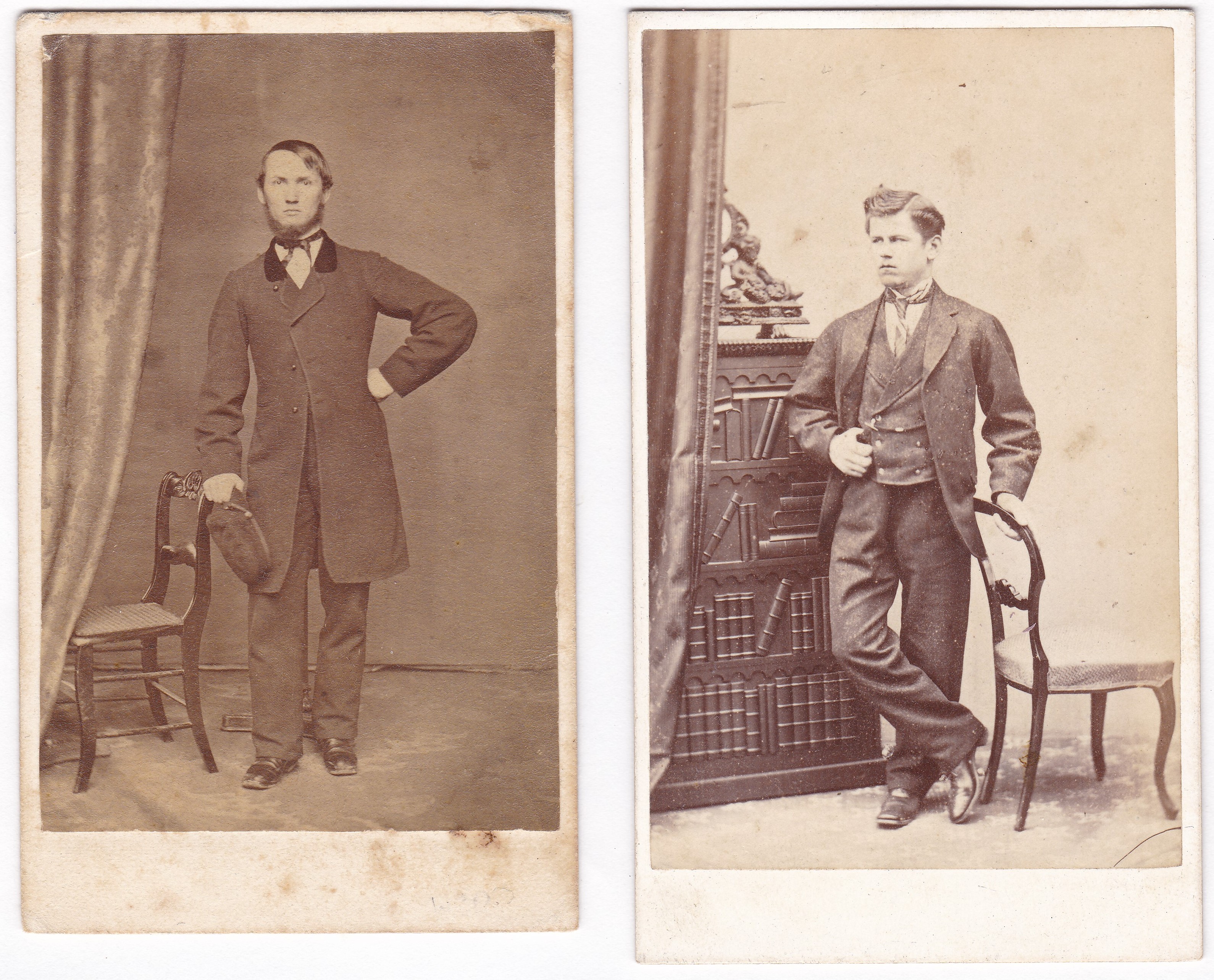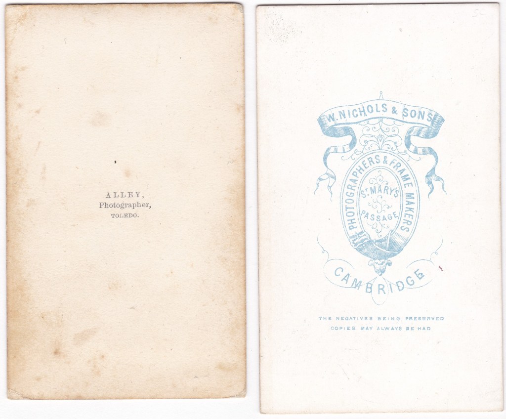 I like each of these little carte de visite images separately, but when I looked at them side by side, my attention was drawn to the way the juxtapositions of their bodies to the furniture gives the impression of a height difference, which is why I decided to share them together. Is the man on the left actually taller than the man on the right, or has he been given a smaller chair to pose with? He appears to be leaning over a bit, so maybe they didn’t have a taller chair, though perhaps that lean was the desired effect all along. The cabinet on the right adds to the effect that the man on the right is shorter, but I still wonder. Both are perfectly fine portraits, so at the end of the day it doesn’t really matter. On a separate topic, I noticed that the man on the left is holding a hat that looks a bit like a soldier’s hat, though the rest of his outfit doesn’t appear to be a uniform. If so, is this perhaps a formal civilian portrait that nevertheless nods to his service? Below are the backs [click to enlarge]. The one on the left, which I’m guessing is the older of the two photos, simply says “Alley, Photographer, Toledo”. I suspect that’s Ezra H. Alley of Toledo, Ohio. The one on the right is W. Nichols & Sons of Cambridge, England. I found an article on Alley here and an article on Nichols here, both of which speculate that these photographers were the first photographers in their respective towns.