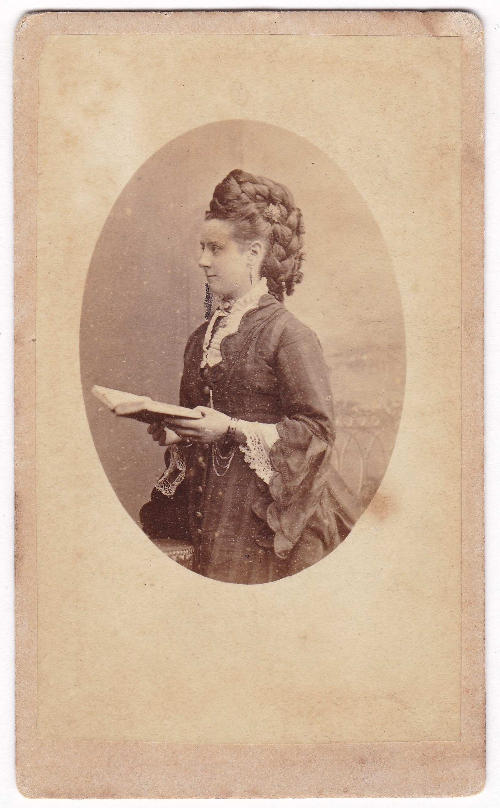 I’ll admit I got this carte de visite photo just because I was so dazzled by her hair. Is it all even hers? Once I enlarged it, I was intrigued by her bracelet, which has a rigidly geometric pattern that seems in contrast to the softer, lacier quality of the rest of her outfit. By the way, the blotch that look like ectoplasm coming out of her mouth is just damage to the photo. The photographer, for those interested, is J. Perkins of Bath, England.