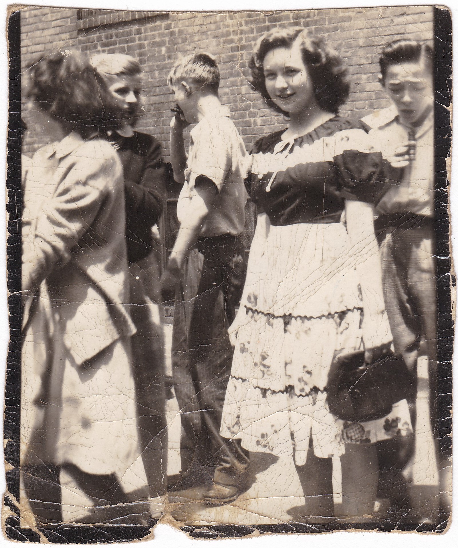 I don’t know why I’m so often drawn to pictures like this. It’s small (2.5 x 3 inches), and badly damaged, full of creases and tears. The lighting and focus are imperfect, and only one person is posed in a way that lets them be seen clearly. But the image has an energy and a joy to it, and the damage strangely enhances the sense of nostalgia. Objectively, it’s a wreck. But subjectively, it feels like a fleeting memory of a happy time. (By the way, I’ve struggled to figure out what the boys have in their mouths. At first I thought they might be whistles or some sort of musical instrument, but now I think they are duck calls. Let me know if you have any better ideas.)