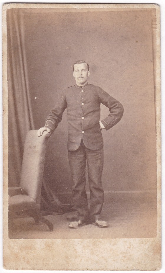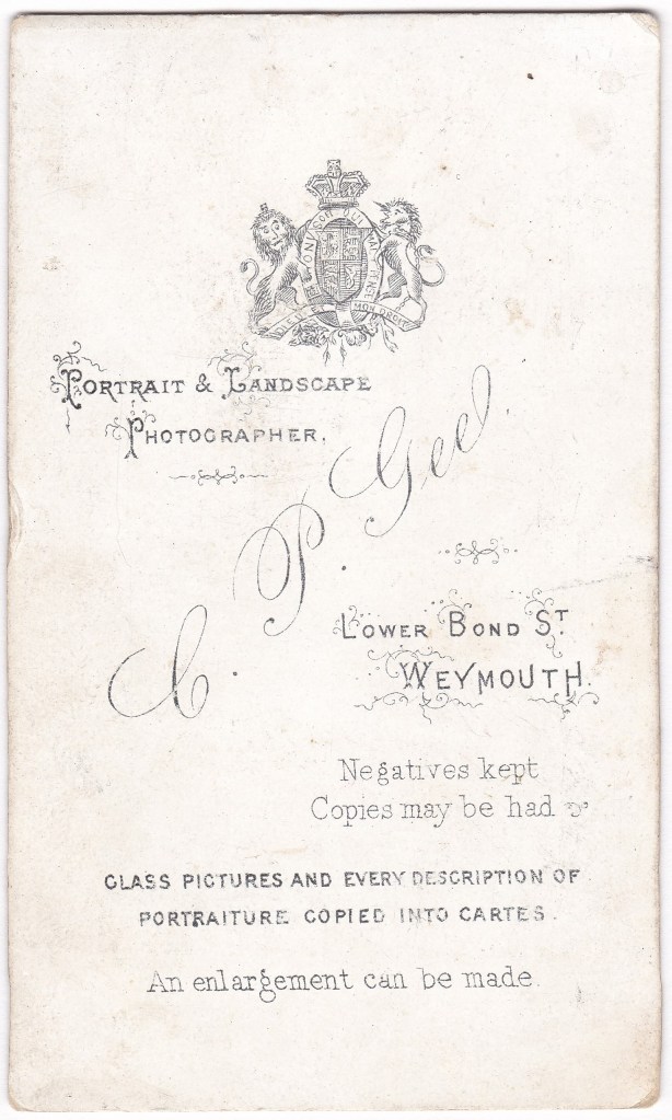 Here’s another simple little carte de visite image showing a man standing there. But looking at his handsome face, I noticed his unusual collar, and started to pay closer attention. Is that a uniform of some sort? Oh, and look, there’s a posing stand peeking out from behind his feet. And those shoes! Is the light hitting them strangely, or are they really as filthy or scuffed as they seem? Intrigued, I brought it home and enlarged it. Only then did I notice the fancy design sewn into the sleeves. That must be a uniform, but what kind? I’d guess anything from a bellhop to a band member, but I’m really not sure. I’m happy to hear people’s thoughts on that. I assumed the arm-akimbo pose was meant to convey his confidence, but now I think it’s also intended to display the sleeves. By the way, I think the photographer is C. P. Geel, if I’m reading the old-timey font correctly. The internet tells me there was also a photographer named W. Burmain Geel in Weymouth at a different address. Relatives? Coincidence? Either way, if you’re interested, here is the back [click to enlarge]:
