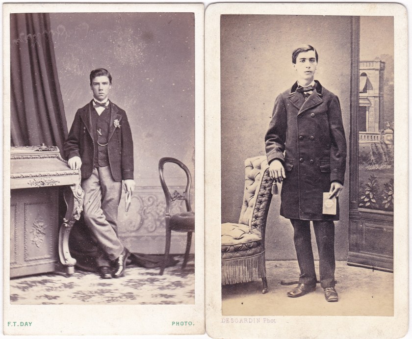 These two little carte de visite images are from different countries (England and France), and show differences in the settings, the clothes, the positioning of the feet, and even the distance of the subject from the camera. But the poses are similar enough (right arm leaning, left arm holding a book) that the pictures still manage to feel similar to me. The boy on the left was photographed by F. T. Day in Saffron Walden, England. The photo on the right was by Desgardin of Saint Brieuc, France. There were two photographers named Desgardin in Saint Brieuc, a father and son, both named Auguste. But the dates of the father (1842-1918) and son (1873-1938) suggest that this photo was taken by the father. For those interested, here are the backs [click to enlarge]: