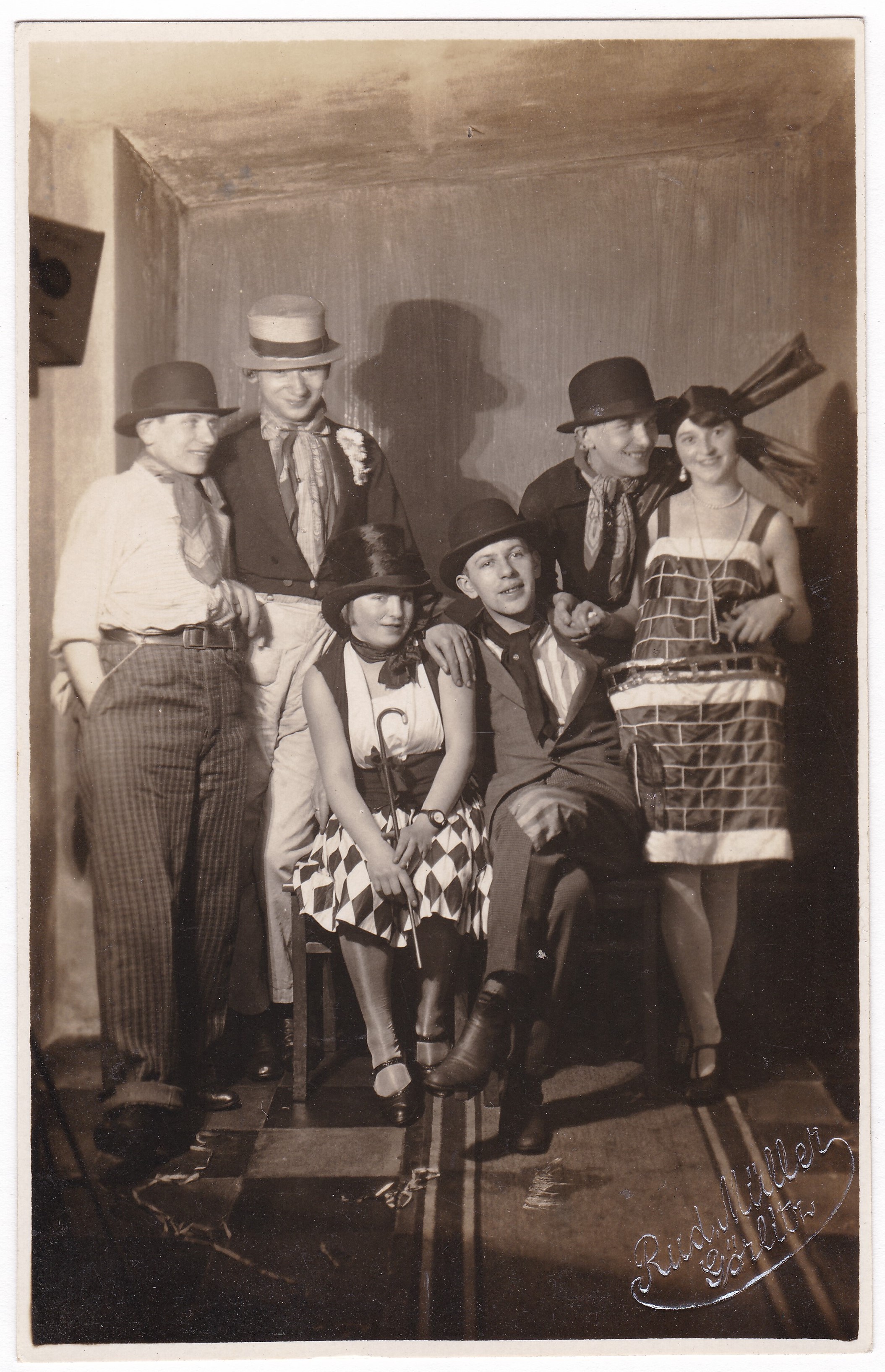 This is a real photo post card with no information except the identity of the photographer, Rudolf Müller in Görlitz, a town in Germany (in what would later be East Germany), identified by the embossed logo in the lower right of the image, plus a very faint stamp on the back. But there is no post card logo to help determine the date, and no information about who these people are. I initially assumed they were a group of Weimar-era actors or cabaret performers, but I’m also thinking they could be a group of friends decked out for a costume party, with what look like stray streamers on the floor suggesting a celebration. The person on the far left appears to be a woman in drag, and it’s hard not to love the brick dress and the giant bow that make the woman on the right look like a windmill. Whoever they are, and whatever they are doing, this image delights me. [As a side note, there are plenty of examples of this photographer’s work online, but finding biographical information about him is tricky because it seems there was also a man with the same name in the same town who was the local bishop, and whose information shows up more readily.]