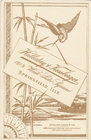 Here’s another attractive portrait that nevertheless puzzles me a bit, so I’ll put it out there for people’s thoughts. She’s standing confidently, wearing what appears to me to be an elegant dress, posing in a studio set suggesting an upscale home, and holding a book, suggesting education and leisure. And yet she’s also wearing an apron. To my eyes, the apron isn’t an accessory to the dress, like the apron on a dirndl. Is she implying that, despite the book and the fashion, she’s domestic at heart? There might be an obvious answer that I’m just not seeing. As a side note, the more I look at the details of the urn and table to the right, the more remarkable I think they are. This is a cabinet card by Halliday & Kessberger of Springfield, Illinois. I’m guessing that’s Henry Halliday and August Kessberger, who seem to have been in partnership in the late 1880s (in as far as the internet is reliable). Samples of their work can be found in this page of 1880s images here. But the page of 1890s images here shows Halliday working alone, and Kessberger having begun working with Victor Georg. This page here indicates Kessberger and Georg were in partnership from around 1897 to 1902, at which point Kessberg opened his own studio. A picture of Kessberger is here. And since the back is pretty, you can click on the below image to see it larger.