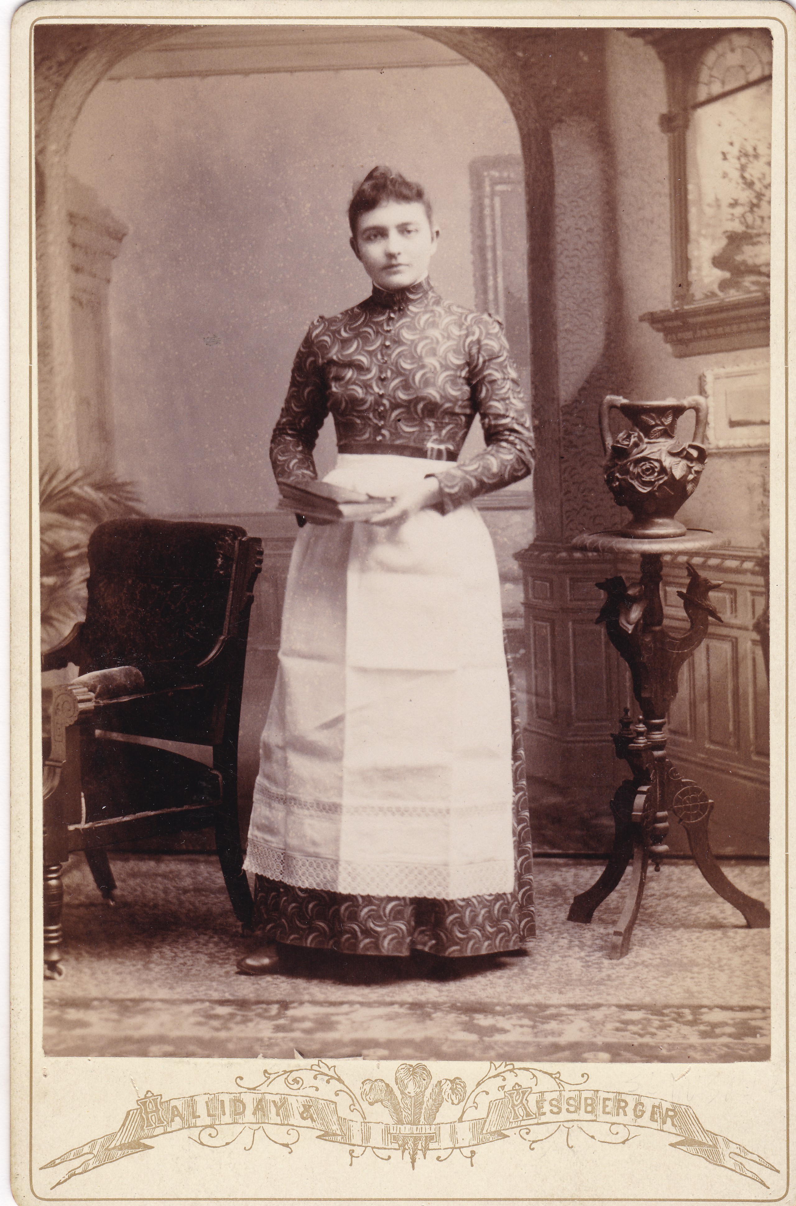 I wonder if it could be a symbol of something other than domestic work, like, something a young academic would wear? (Since she’s holding books, although they could be something like family albums.) I did a very brief search, and did find a New Zealand history page saying that little girls often wore aprons to school in the Victorian era. Just speculating.