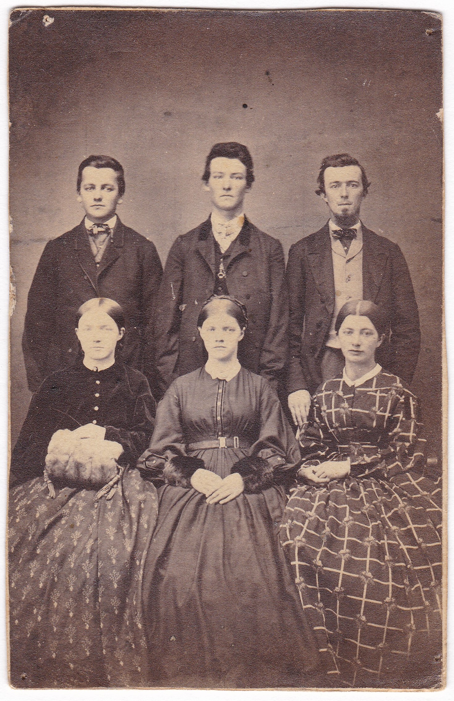 A couple of things cross my mind when I look at this little CDV. One is the very fact that carte de visite (CDV) is French for visiting card, the name of this type of photo stemming from the calling cards used in those days for social visits. I know that the photographic kind weren’t used in the same way, but it amuses me to think of this group of six people all showing up at somebody’s house together and using this photo as their collective calling card. The other thing that crosses my mind is the fact that this is considered a Civil War-era image because it has a 3-cent revenue stamp on the back. The stamps were required from September 1, 1864 to August 1, 1866, which means this photo was taken either in the last year of the war, or the year after it ended. I just finished reading a novel that took place partly during the Civil War, and the young man at the center of it had to justify not volunteering to enlist, despite the social pressure, especially when two of his brothers did enlist. With that fresh in my mind, I wonder about what pressures these young men faced at that time, and whether any of them did end up serving. I’m fascinated by the way a single contextual clue can open up avenues of interest and speculation in an otherwise mundane (though perfectly attractive) portrait. The photographer, by the way, is C. C. Burkholder of Lewistown, Pennsylvania. I believe that’s Charles Correll Burkholder (1827-1884). A tiny bit of information, including pictures of him, can be found here.